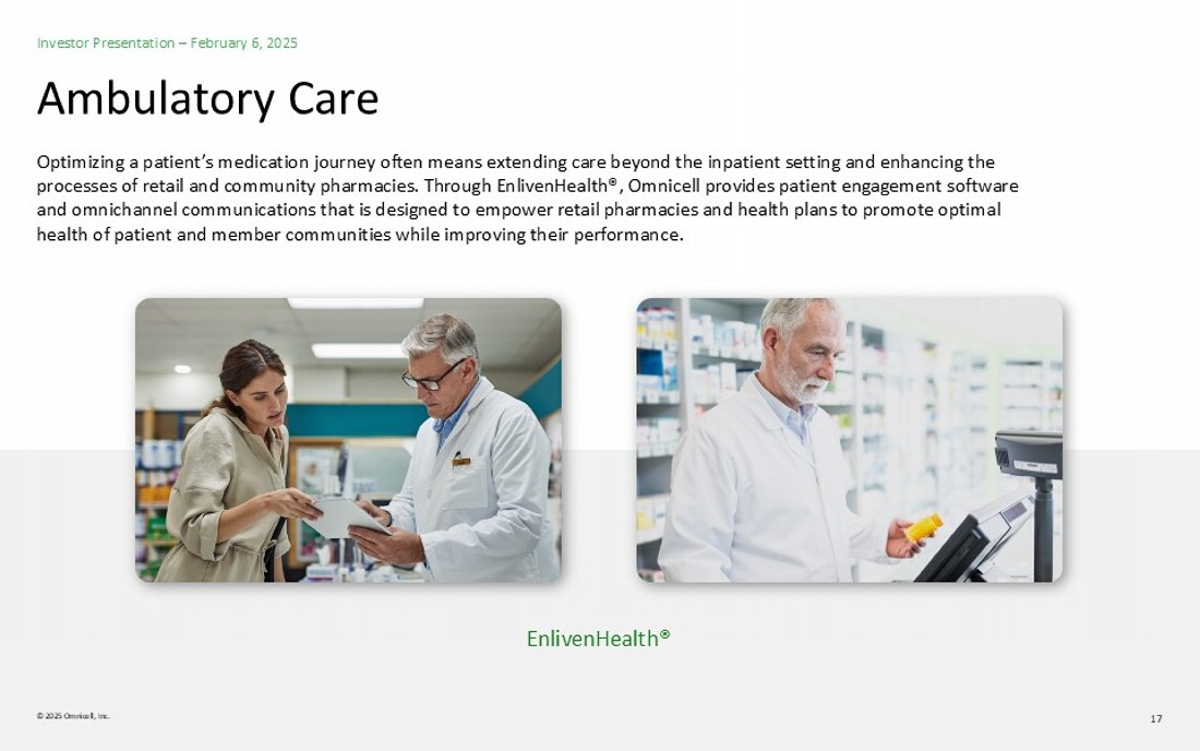 © 2025 Omnicell, Inc. 16 Specialty Pharmacy Omnicell 340B Specialty Pharmacy Services Investor Presentation – February 6, 2025 As medical innovations create new, more complex drugs, many pharmacies need specialized tools and expertise to help manage the patient’s treatment journey. Opening or optimizing an in - house specialty pharmacy often requires unique capabilities to navigate the demands of high - cost, high - touch medications. Omnicell seeks to deliver the technology and know - how to help customers accelerate and maximize specialty pharmacy outcomes.