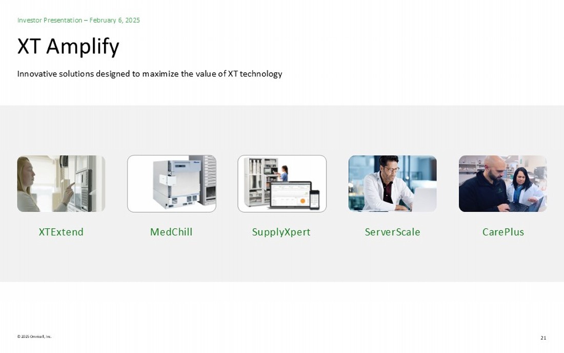 © 2025 Omnicell, Inc. 20 Omnicell 2024 Innovation Investor Presentation – February 6, 2025 XT Amplify April 2024 Innovative suite of solutions designed to enhance pharmacy and nursing efficiency, reduce medication errors and waste, and maximize the value of the XT Automated Dispensing System Central Med Automation Service August 2024 A complete solution combining robotics and smart devices, intelligent software, and expert services intended to centralize medication management and streamline efficiency and scalability OmniSphere December 2024 Next - generation, cloud native, software workflow engine and data platform intended to seamlessly integrate enterprise robotics and smart devices across the continuum of care