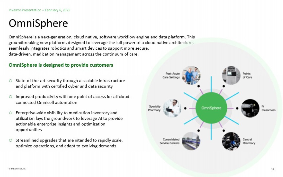 © 2025 Omnicell, Inc. 23 OmniSphere Investor Presentation – February 6, 2025 o State - of - the - art security through a scalable infrastructure and platform with certified cyber and data security o Improved productivity with one point of access for all cloud - connected Omnicell automation o Enterprise - wide visibility to medication inventory and utilization lays the groundwork to leverage AI to provide actionable enterprise insights and optimization opportunities o Streamlined upgrades that are intended to rapidly scale, optimize operations, and adapt to evolving demands OmniSphere is a next - generation, cloud native, software workflow engine and data platform. This groundbreaking new platform, designed to leverage the full power of a cloud native architecture, seamlessly integrates robotics and smart devices to support more secure, data - driven, medication management across the continuum of care. OmniSphere is designed to provide customers