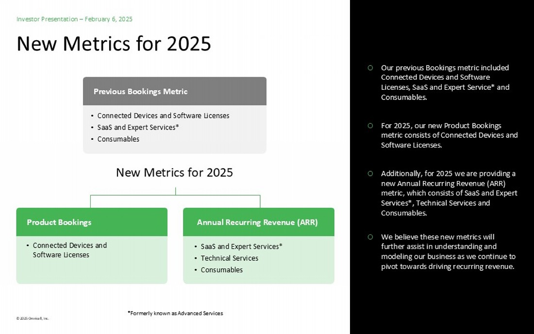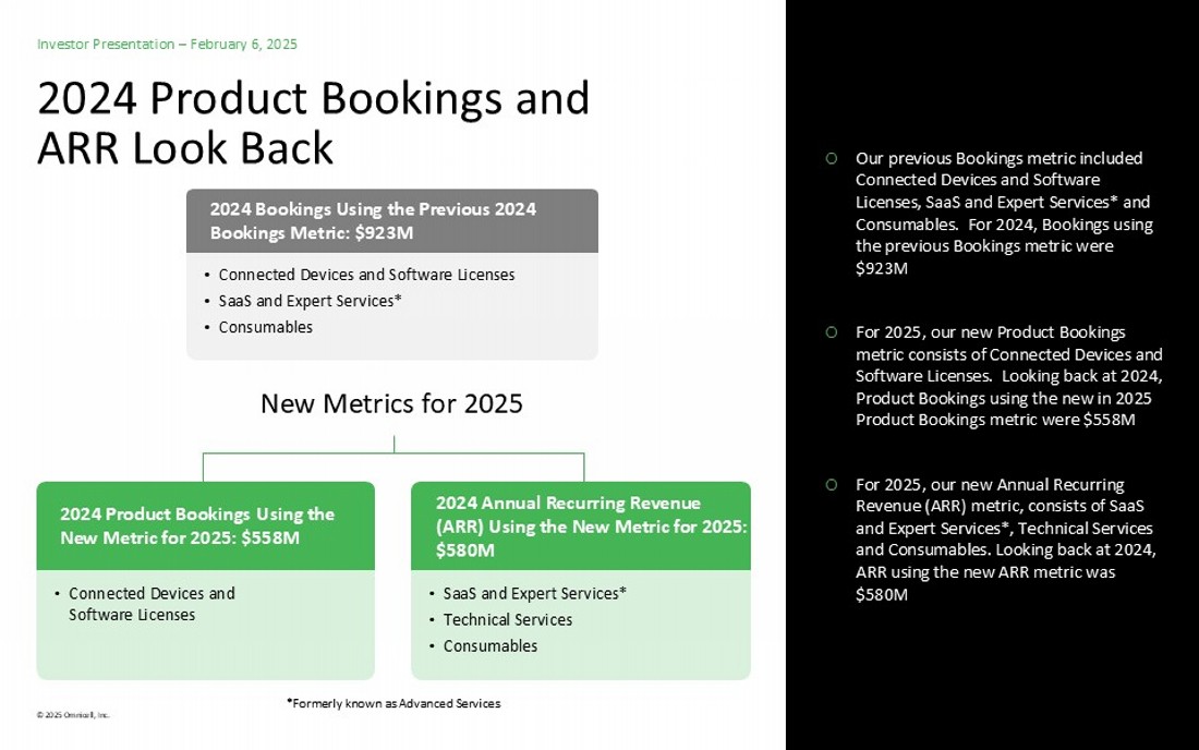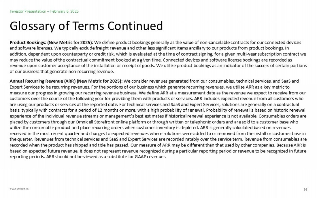© 2025 Omnicell, Inc. 36 Glossary of Terms Continued Investor Presentation – February 6, 2025 Product Bookings: (New Metric for 2025): We define product bookings generally as the value of non - cancelable contracts for our connected devices and software licenses. We typically exclude freight revenue and other less significant items ancillary to our products from p rod uct bookings. In addition, dependent upon counterparty or credit risk, which is evaluated at the time of contract signing, for a given multi - year subscription contract we may reduce the value of the contractual commitment booked at a given time. Connected devices and software license bookings ar e r ecorded as revenue upon customer acceptance of the installation or receipt of goods. We utilize product bookings as an indicator of the suc cess of certain portions of our business that generate non - recurring revenue. Annual Recurring Revenue (ARR) (New Metric for 2025): We consider revenues generated from our consumables, technical services, and SaaS and Expert Services to be recurring revenues. For the portions of our business which generate recurring revenues, we utilize ARR as a key metric to measure our progress in growing our recurring revenue business. We define ARR at a measurement date as the revenue we expect to receive from our customers over the course of the following year for providing them with products or services. ARR includes expected revenue f rom all customers who are using our products or services at the reported date. For technical services and SaaS and Expert Services, solutions are g ene rally on a contractual basis, typically with contracts for a period of 12 months or more, with a high probability of renewal. Probability of renewal is based on historic renewal experience of the individual revenue streams or management’s best estimates if historical renewal experience is not available . C onsumables orders are placed by customers through our Omnicell Storefront online platform or through written or telephonic orders and are sold to a cu stomer base who utilize the consumable product and place recurring orders when customer inventory is depleted. ARR is generally calculated ba sed on revenues received in the most recent quarter and changes to expected revenues where solutions were added to or removed from the instal l o r customer base in the quarter. Revenues from technical services and SaaS and Expert Services are recorded ratably over the service term. Revenu e f rom consumables are recorded when the product has shipped and title has passed. Our measure of ARR may be different than that used by other compa nie s. Because ARR is based on expected future revenue, it does not represent revenue recognized during a particular reporting period or revenue to be recognized in future reporting periods. ARR should not be viewed as a substitute for GAAP revenues.