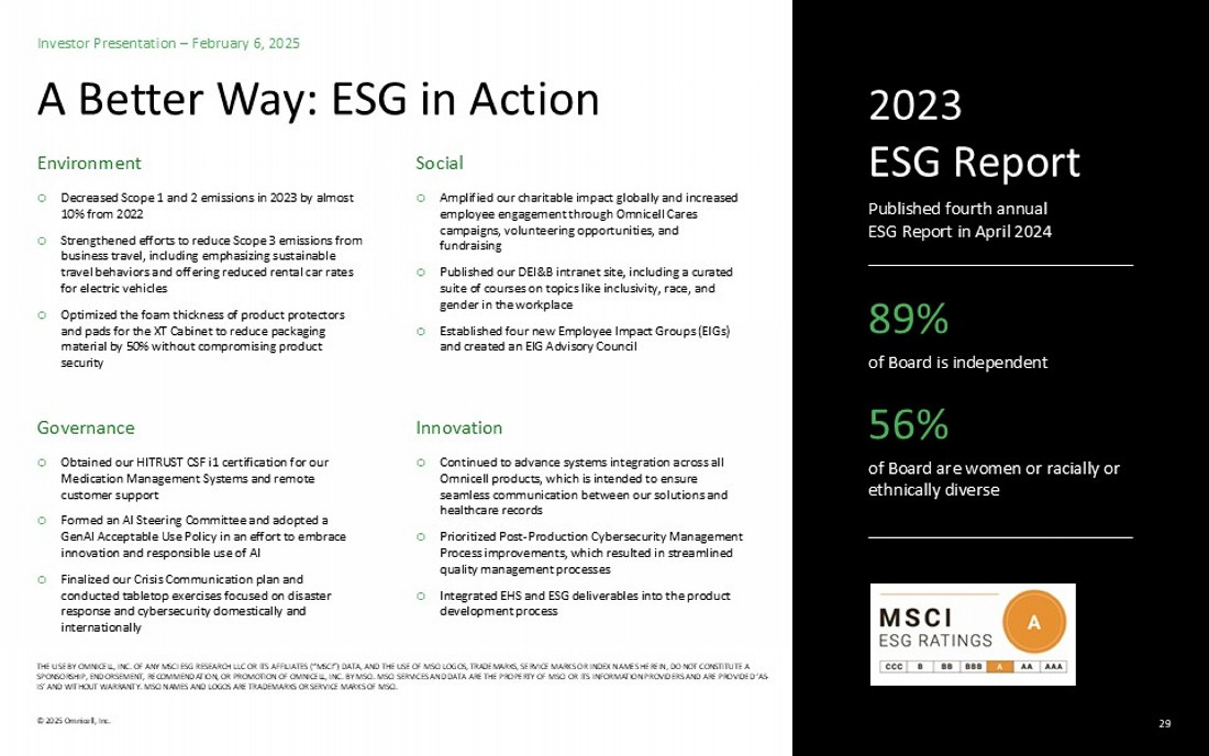 © 2025 Omnicell, Inc. A Better Way: ESG in Action Investor Presentation – February 6, 2025 Environment 89% of Board is independent 56% of Board are women or racially or ethnically diverse 2023 ESG Report Published fourth annual ESG Report in April 2024 o Decreased Scope 1 and 2 emissions in 2023 by almost 10% from 2022 o Strengthened efforts to reduce Scope 3 emissions from business travel, including emphasizing sustainable travel behaviors and offering reduced rental car rates for electric vehicles o Optimized the foam thickness of product protectors and pads for the XT Cabinet to reduce packaging material by 50% without compromising product security Governance o Obtained our HITRUST CSF i1 certification for our Medication Management Systems and remote customer support o Formed an AI Steering Committee and adopted a GenAI Acceptable Use Policy in an effort to embrace innovation and responsible use of AI o Finalized our Crisis Communication plan and conducted tabletop exercises focused on disaster response and cybersecurity domestically and internationally Social o Amplified our charitable impact globally and increased employee engagement through Omnicell Cares campaigns, volunteering opportunities, and fundraising o Published our DEI&B intranet site, including a curated suite of courses on topics like inclusivity, race, and gender in the workplace o Established four new Employee Impact Groups (EIGs) and created an EIG Advisory Council Innovation o Continued to advance systems integration across all Omnicell products, which is intended to ensure seamless communication between our solutions and healthcare records o Prioritized Post - Production Cybersecurity Management Process improvements, which resulted in streamlined quality management processes o Integrated EHS and ESG deliverables into the product development process THE USE BY O MNICELL , INC. OF ANY MSCI ESG RESEARCH LLC OR ITS AFFILIATES (“MSCI”) DATA, AND THE USE OF MSCI LOGOS, TRA DEMARKS, SERVICE MARKS OR INDEX NAMES HEREIN, DO NOT CONSTITUTE A SPONSORSHIP, ENDORSEMENT, RECOMMENDATION, OR PROMOTION OF O MNICELL , INC. BY MSCI. MSCI SERVICES AND DATA ARE THE PROPERTY OF MSCI OR ITS INFORMATION PROVIDERS AND ARE PROVIDED ‘AS - IS’ AND WITHOUT WARRANTY. MSCI NAMES AND LOGOS ARE TRADEMARKS OR SERVICE MARKS OF MSCI. 29