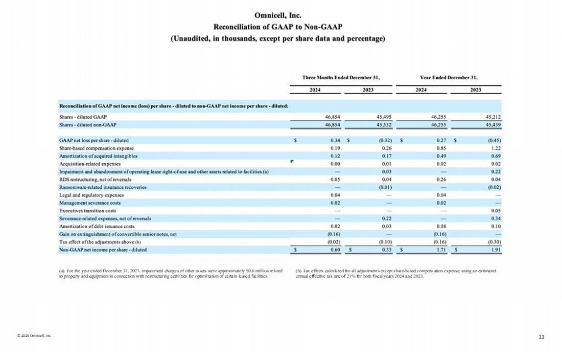 © 2025 Omnicell, Inc. 32 (a) For the year ended December 31, 2023, impairment charges of other assets were approximately $0.6 million related to property and equipment in connection with restructuring activities for optimization of certain leased facilities. (b) Tax effects calculated for all adjustments except share - based compensation expense, using an estimated annual effective tax rate of 21% for both fiscal years 2024 and 2023.