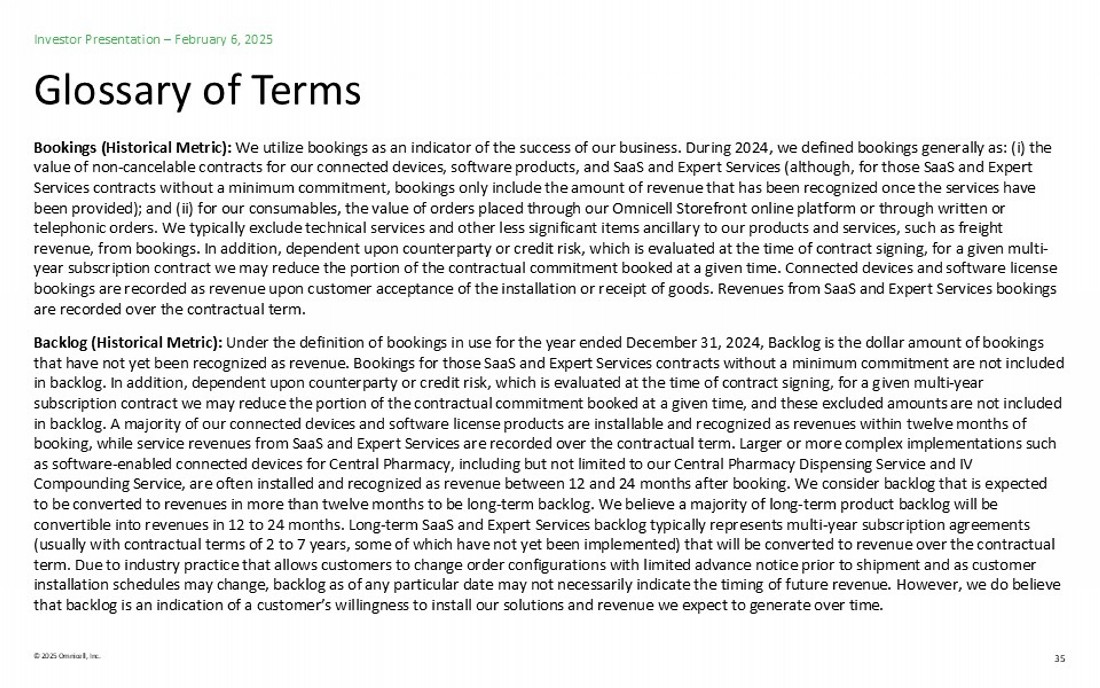 © 2025 Omnicell, Inc. 35 Glossary of Terms Investor Presentation – February 6, 2025 Bookings (Historical Metric): We utilize bookings as an indicator of the success of our business. During 2024, we defined bookings generally as: ( i ) the value of non - cancelable contracts for our connected devices, software products, and SaaS and Expert Services (although, for thos e SaaS and Expert Services contracts without a minimum commitment, bookings only include the amount of revenue that has been recognized once th e s ervices have been provided); and (ii) for our consumables, the value of orders placed through our Omnicell Storefront online platform or t hro ugh written or telephonic orders. We typically exclude technical services and other less significant items ancillary to our products and ser vic es, such as freight revenue, from bookings. In addition, dependent upon counterparty or credit risk, which is evaluated at the time of contract s ign ing, for a given multi - year subscription contract we may reduce the portion of the contractual commitment booked at a given time. Connected devices and software license bookings are recorded as revenue upon customer acceptance of the installation or receipt of goods. Revenues from SaaS and Exp ert Services bookings are recorded over the contractual term. Backlog (Historical Metric): Under the definition of bookings in use for the year ended December 31, 2024, Backlog is the dollar amount of bookings that have not yet been recognized as revenue. Bookings for those SaaS and Expert Services contracts without a minimum commitm ent are not included in backlog. In addition, dependent upon counterparty or credit risk, which is evaluated at the time of contract signing, for a g iven multi - year subscription contract we may reduce the portion of the contractual commitment booked at a given time, and these excluded amou nts are not included in backlog. A majority of our connected devices and software license products are installable and recognized as revenues with in twelve months of booking, while service revenues from SaaS and Expert Services are recorded over the contractual term. Larger or more complex imp lementations such as software - enabled connected devices for Central Pharmacy, including but not limited to our Central Pharmacy Dispensing Service and IV Compounding Service, are often installed and recognized as revenue between 12 and 24 months after booking. We consider backlo g t hat is expected to be converted to revenues in more than twelve months to be long - term backlog. We believe a majority of long - term product backl og will be convertible into revenues in 12 to 24 months. Long - term SaaS and Expert Services backlog typically represents multi - year subscri ption agreements (usually with contractual terms of 2 to 7 years, some of which have not yet been implemented) that will be converted to reven ue over the contractual term. Due to industry practice that allows customers to change order configurations with limited advance notice prior to ship men t and as customer installation schedules may change, backlog as of any particular date may not necessarily indicate the timing of future revenu e. However, we do believe that backlog is an indication of a customer’s willingness to install our solutions and revenue we expect to generate over tim e.