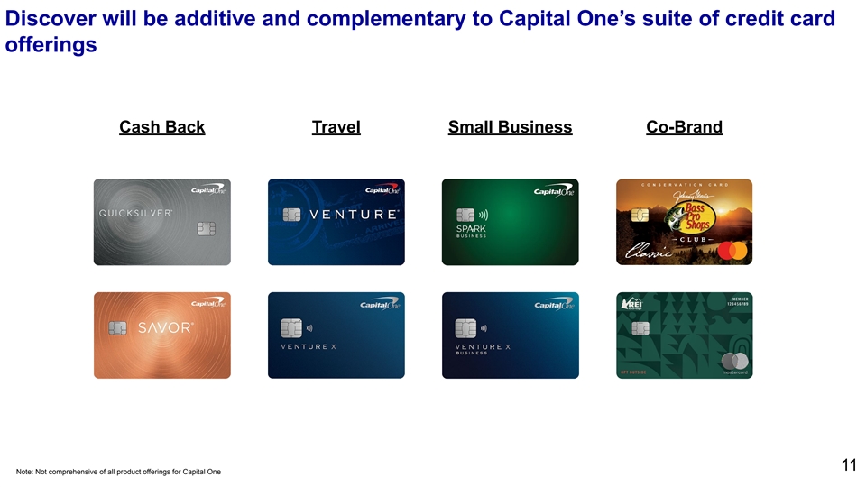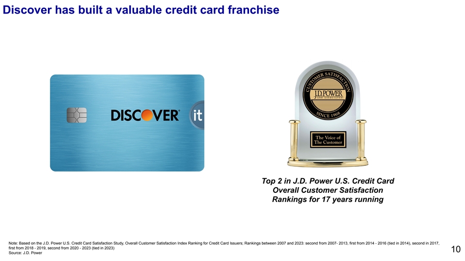 Discover has built a valuable credit card franchise Top 2 in J.D. Power U.S. Credit Card Overall Customer Satisfaction Rankings for 17 years running Note: Based on the J.D. Power U.S. Credit Card Satisfaction Study, Overall Customer Satisfaction Index Ranking for Credit Card Issuers; Rankings between 2007 and 2023: second from 2007- 2013, first from 2014 - 2016 (tied in 2014), second in 2017, first from 2018 - 2019, second from 2020 - 2023 (tied in 2023) 10 Source: J.D. Power
