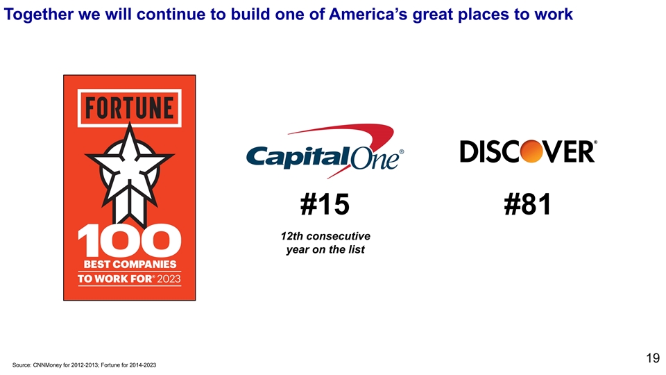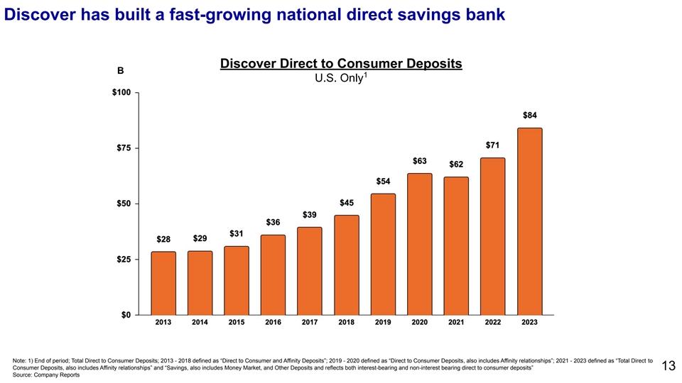 Together, Discover and Capital One will be well-positioned in credit cards 1 2 Credit Card Purchase Volume Credit Card Loans 2023 2023 B B Note: 1) JPM- “Consumer & Community Banking” (includes SMB), “Card Services - Sales volume excluding commercial card”; AXP- “U.S. Consumer Services” and “Commercial Services” (includes US SME), “Billed Business”; COF- “Domestic Card”, “Purchase volume”; C- “Branded Cards” and “Retail Services”, “Credit card spend volume”; BAC- “Consumer Banking”, “Total credit card - Purchase volumes”; DFS- “Discover Card Sales Volume”; SYF- “Purchase volume”; WFC- “Consumer Banking and Lending Segment”, “Credit Card- Point of sale volume”; 2) End of period loans; JPM- “Consumer & Community Banking”, “Loans - Card Services”; C- “Branded Cards” and “Retail Services”, “EOP Loans”; AXP- “U.S. Consumer Services” and “Commercial Services”, “Card Member loans - Total loans” and “Card Member receivables - Total receivables”; COF- “Credit card - Domestic credit card”, “Loans Held for Investment (Period-End)”; Discover- “Credit Card Loans”, “Ending Loans”; BAC- “Consumer Banking”, “Total credit card - Ending credit card outstandings”; SYF- “Loans - Credit cards”; WFC- “Consumer Banking and Lending Segment”, “Loans by Line of Business - Consumer lending, Credit Card” 12 Source: Company Reports