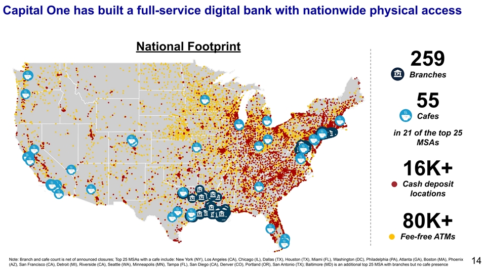 Capital One has built a full-service digital bank with nationwide physical access National Footprint 259 Branches 55 Cafes in 21 of the top 25 MSAs 16K+ Cash deposit locations 80K+ Fee-free ATMs Note: Branch and cafe count is net of announced closures; Top 25 MSAs with a cafe include: New York (NY), Los Angeles (CA), Chicago (IL), Dallas (TX), Houston (TX), Miami (FL), Washington (DC), Philadelphia (PA), Atlanta (GA), Boston (MA), Phoenix 14 (AZ), San Francisco (CA), Detroit (MI), Riverside (CA), Seattle (WA), Minneapolis (MN), Tampa (FL), San Diego (CA), Denver (CO), Portland (OR), San Antonio (TX); Baltimore (MD) is an additional top 25 MSA with branches but no cafe presence