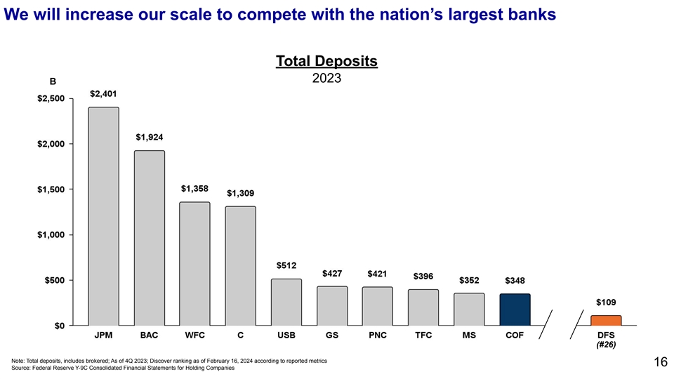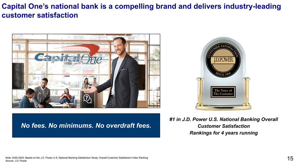 Capital One’s national bank is a compelling brand and delivers industry-leading customer satisfaction #1 in J.D. Power U.S. National Banking Overall No fees. No minimums. No overdraft fees. Customer Satisfaction Rankings for 4 years running Note: 2020-2023, Based on the J.D. Power U.S. National Banking Satisfaction Study, Overall Customer Satisfaction Index Ranking 15 Source: J.D. Power