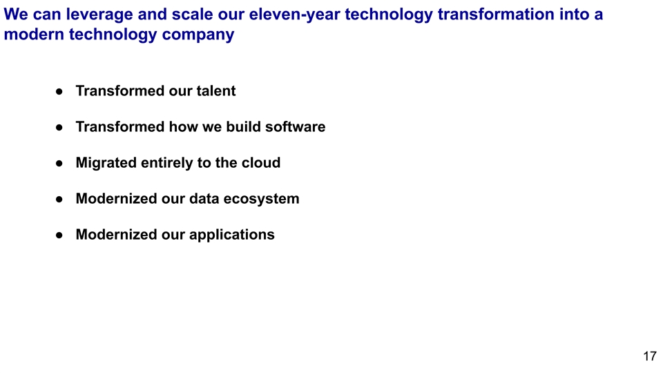 We can leverage and scale our eleven-year technology transformation into a modern technology company ● Transformed our talent ● Transformed how we build software ● Migrated entirely to the cloud ● Modernized our data ecosystem ● Modernized our applications 17