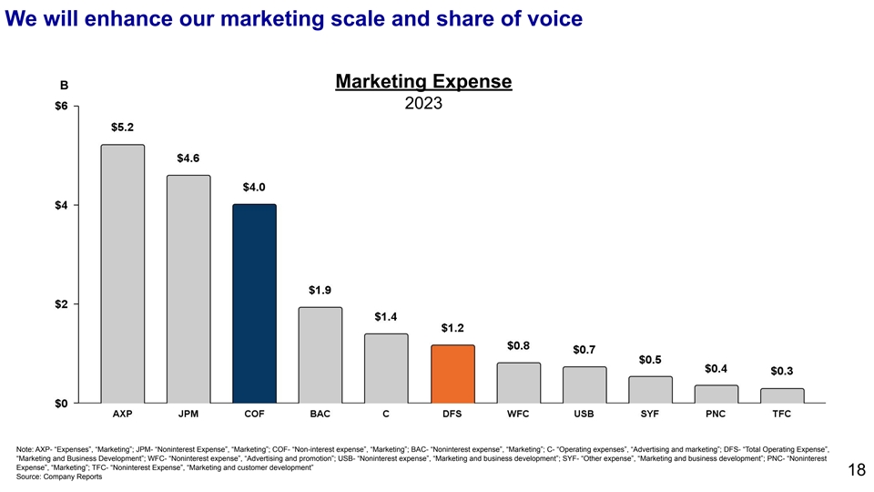 We will enhance our marketing scale and share of voice Marketing Expense B 2023 Note: AXP- “Expenses”, “Marketing”; JPM- “Noninterest Expense”, “Marketing”; COF- “Non-interest expense”, “Marketing”; BAC- “Noninterest expense”, “Marketing”; C- “Operating expenses”, “Advertising and marketing”; DFS- “Total Operating Expense”, “Marketing and Business Development”; WFC- “Noninterest expense”, “Advertising and promotion”; USB- “Noninterest expense”, “Marketing and business development”; SYF- “Other expense”, “Marketing and business development”; PNC- “Noninterest Expense”, “Marketing”; TFC- “Noninterest Expense”, “Marketing and customer development” 18 Source: Company Reports