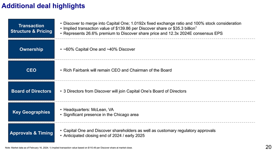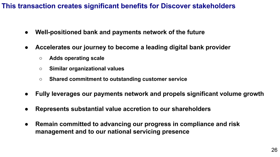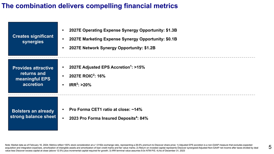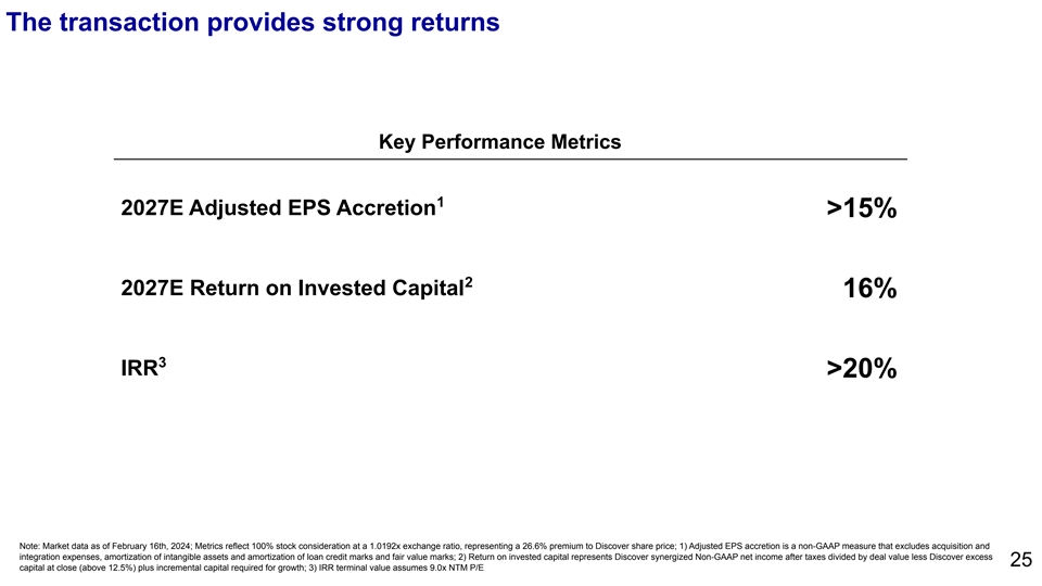 The transaction provides strong returns Key Performance Metrics 1 2027E Adjusted EPS Accretion >15% 2 2027E Return on Invested Capital 16% 3 IRR >20% Note: Market data as of February 16th, 2024; Metrics reflect 100% stock consideration at a 1.0192x exchange ratio, representing a 26.6% premium to Discover share price; 1) Adjusted EPS accretion is a non-GAAP measure that excludes acquisition and integration expenses, amortization of intangible assets and amortization of loan credit marks and fair value marks; 2) Return on invested capital represents Discover synergized Non-GAAP net income after taxes divided by deal value less Discover excess 25 capital at close (above 12.5%) plus incremental capital required for growth; 3) IRR terminal value assumes 9.0x NTM P/E