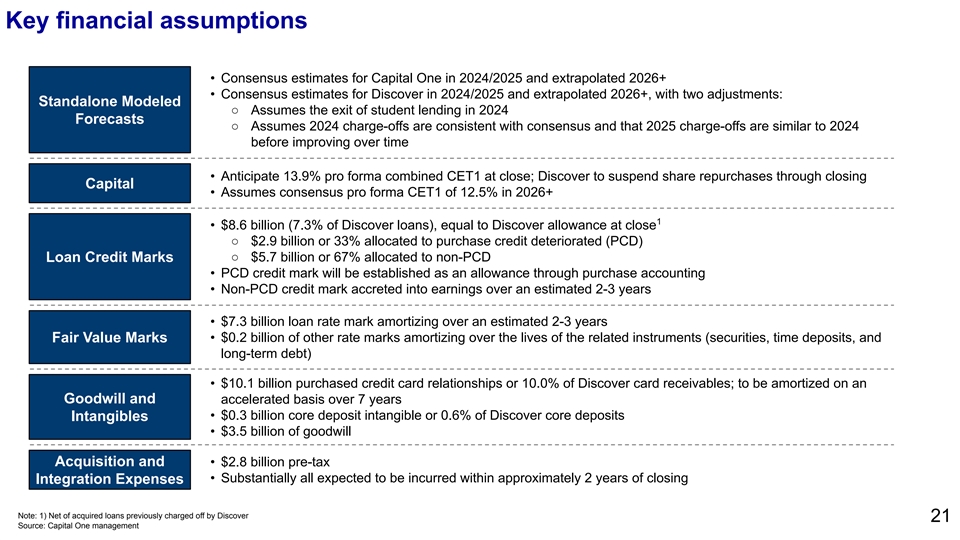 Additional deal highlights • Discover to merge into Capital One; 1.0192x fixed exchange ratio and 100% stock consideration Transaction 1 • Implied transaction value of $139.86 per Discover share or $35.3 billion Structure & Pricing • Represents 26.6% premium to Discover share price and 12.3x 2024E consensus EPS • ~60% Capital One and ~40% Discover Ownership CEO • Rich Fairbank will remain CEO and Chairman of the Board Board of Directors • 3 Directors from Discover will join Capital One’s Board of Directors • Headquarters: McLean, VA Key Geographies • Significant presence in the Chicago area • Capital One and Discover shareholders as well as customary regulatory approvals Approvals & Timing • Anticipated closing end of 2024 / early 2025 Note: Market data as of February 16, 2024; 1) Implied transaction value based on $110.49 per Discover share at market close. 20