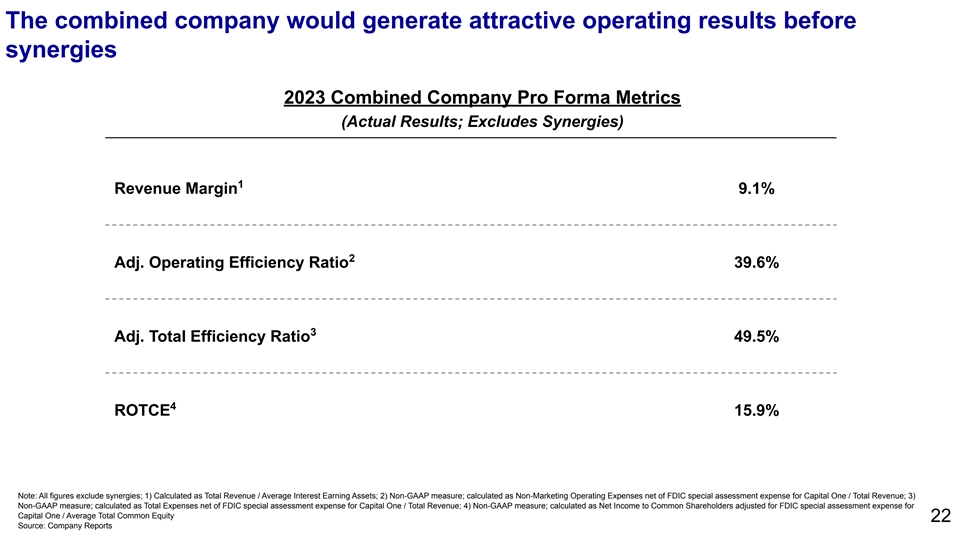 The combined company would generate attractive operating results before synergies 2023 Combined Company Pro Forma Metrics (Actual Results; Excludes Synergies) 1 Revenue Margin 9.1% 2 Adj. Operating Efficiency Ratio 39.6% 3 Adj. Total Efficiency Ratio 49.5% 4 ROTCE 15.9% Note: All figures exclude synergies; 1) Calculated as Total Revenue / Average Interest Earning Assets; 2) Non-GAAP measure; calculated as Non-Marketing Operating Expenses net of FDIC special assessment expense for Capital One / Total Revenue; 3) Non-GAAP measure; calculated as Total Expenses net of FDIC special assessment expense for Capital One / Total Revenue; 4) Non-GAAP measure; calculated as Net Income to Common Shareholders adjusted for FDIC special assessment expense for Capital One / Average Total Common Equity 22 Source: Company Reports