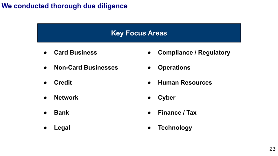 We conducted thorough due diligence Key Focus Areas ● Card Business ● Compliance / Regulatory ● Non-Card Businesses ● Operations ● Credit ● Human Resources ● Network ● Cyber ● Bank ● Finance / Tax ● Legal ● Technology 23