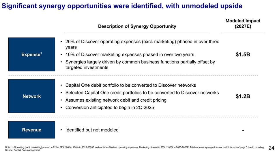 Significant synergy opportunities were identified, with unmodeled upside Modeled Impact Description of Synergy Opportunity (2027E) • 26% of Discover operating expenses (excl. marketing) phased in over three years 1 Expense • 10% of Discover marketing expenses phased in over two years $1.5B • Synergies largely driven by common business functions partially offset by targeted investments • Capital One debit portfolio to be converted to Discover networks • Selected Capital One credit portfolios to be converted to Discover networks Network $1.2B • Assumes existing network debit and credit pricing • Conversion anticipated to begin in 2Q 2025 Revenue • Identified but not modeled - Note: 1) Operating (excl. marketing) phased in 22% / 67% / 98% / 100% in 2025-2028E and excludes Student operating expenses; Marketing phased in 50% / 100% in 2025-2026E; Total expense synergy does not match to sum of page 5 due to rounding 24 Source: Capital One management