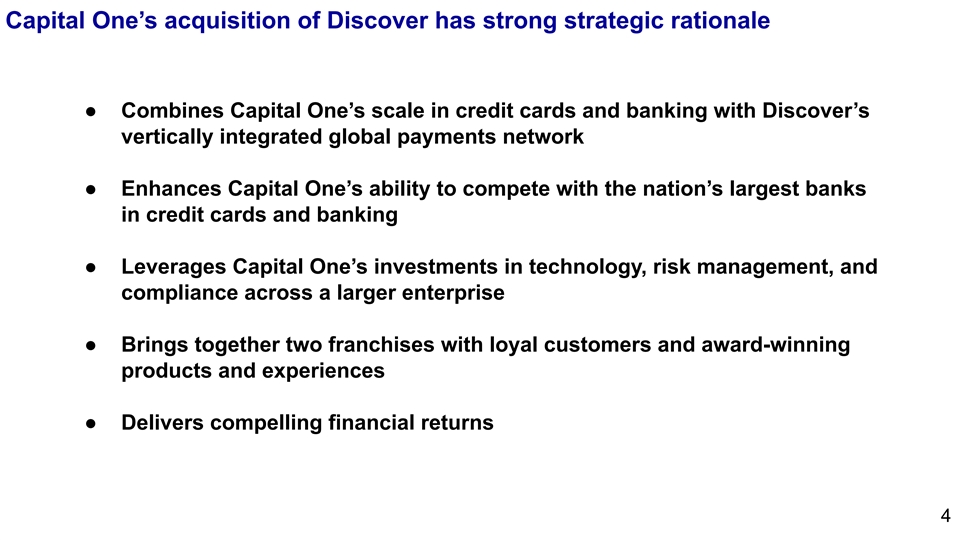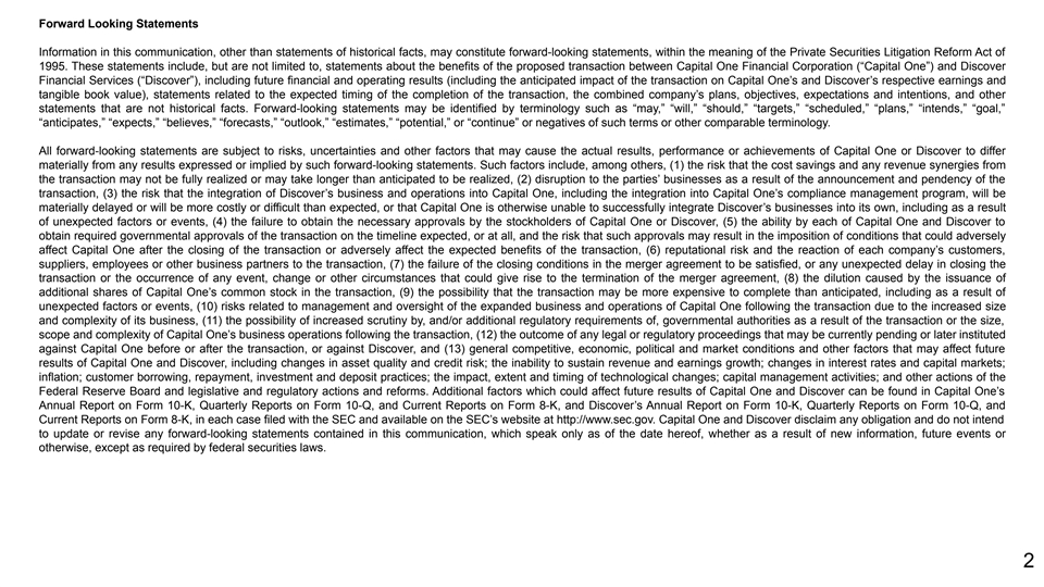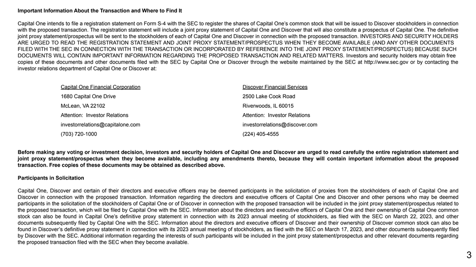 Forward Looking Statements Information in this communication, other than statements of historical facts, may constitute forward-looking statements, within the meaning of the Private Securities Litigation Reform Act of 1995. These statements include, but are not limited to, statements about the benefits of the proposed transaction between Capital One Financial Corporation (“Capital One”) and Discover Financial Services (“Discover”), including future financial and operating results (including the anticipated impact of the transaction on Capital One’s and Discover’s respective earnings and tangible book value), statements related to the expected timing of the completion of the transaction, the combined company’s plans, objectives, expectations and intentions, and other statements that are not historical facts. Forward-looking statements may be identified by terminology such as “may,” “will,” “should,” “targets,” “scheduled,” “plans,” “intends,” “goal,” “anticipates,” “expects,” “believes,” “forecasts,” “outlook,” “estimates,” “potential,” or “continue” or negatives of such terms or other comparable terminology. All forward-looking statements are subject to risks, uncertainties and other factors that may cause the actual results, performance or achievements of Capital One or Discover to differ materially from any results expressed or implied by such forward-looking statements. Such factors include, among others, (1) the risk that the cost savings and any revenue synergies from the transaction may not be fully realized or may take longer than anticipated to be realized, (2) disruption to the parties’ businesses as a result of the announcement and pendency of the transaction, (3) the risk that the integration of Discover’s business and operations into Capital One, including the integration into Capital One’s compliance management program, will be materially delayed or will be more costly or difficult than expected, or that Capital One is otherwise unable to successfully integrate Discover’s businesses into its own, including as a result of unexpected factors or events, (4) the failure to obtain the necessary approvals by the stockholders of Capital One or Discover, (5) the ability by each of Capital One and Discover to obtain required governmental approvals of the transaction on the timeline expected, or at all, and the risk that such approvals may result in the imposition of conditions that could adversely affect Capital One after the closing of the transaction or adversely affect the expected benefits of the transaction, (6) reputational risk and the reaction of each company’s customers, suppliers, employees or other business partners to the transaction, (7) the failure of the closing conditions in the merger agreement to be satisfied, or any unexpected delay in closing the transaction or the occurrence of any event, change or other circumstances that could give rise to the termination of the merger agreement, (8) the dilution caused by the issuance of additional shares of Capital One’s common stock in the transaction, (9) the possibility that the transaction may be more expensive to complete than anticipated, including as a result of unexpected factors or events, (10) risks related to management and oversight of the expanded business and operations of Capital One following the transaction due to the increased size and complexity of its business, (11) the possibility of increased scrutiny by, and/or additional regulatory requirements of, governmental authorities as a result of the transaction or the size, scope and complexity of Capital One’s business operations following the transaction, (12) the outcome of any legal or regulatory proceedings that may be currently pending or later instituted against Capital One before or after the transaction, or against Discover, and (13) general competitive, economic, political and market conditions and other factors that may affect future results of Capital One and Discover, including changes in asset quality and credit risk; the inability to sustain revenue and earnings growth; changes in interest rates and capital markets; inflation; customer borrowing, repayment, investment and deposit practices; the impact, extent and timing of technological changes; capital management activities; and other actions of the Federal Reserve Board and legislative and regulatory actions and reforms. Additional factors which could affect future results of Capital One and Discover can be found in Capital One’s Annual Report on Form 10-K, Quarterly Reports on Form 10-Q, and Current Reports on Form 8-K, and Discover’s Annual Report on Form 10-K, Quarterly Reports on Form 10-Q, and Current Reports on Form 8-K, in each case filed with the SEC and available on the SEC’s website at http://www.sec.gov. Capital One and Discover disclaim any obligation and do not intend to update or revise any forward-looking statements contained in this communication, which speak only as of the date hereof, whether as a result of new information, future events or otherwise, except as required by federal securities laws. 2