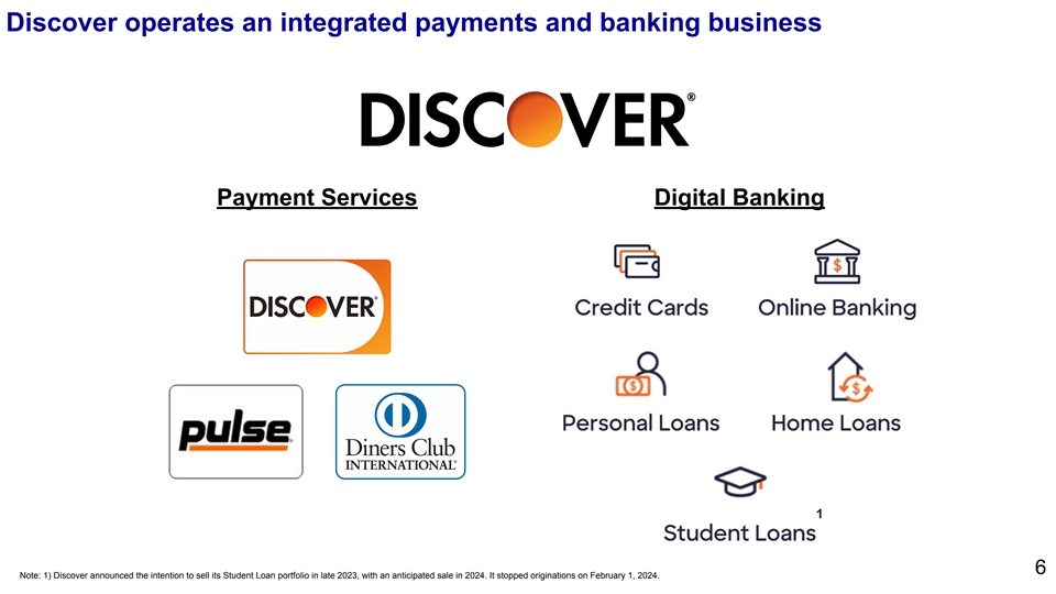 Discover operates an integrated payments and banking business Payment Services Digital Banking 1 6 Note: 1) Discover announced the intention to sell its Student Loan portfolio in late 2023, with an anticipated sale in 2024. It stopped originations on February 1, 2024.