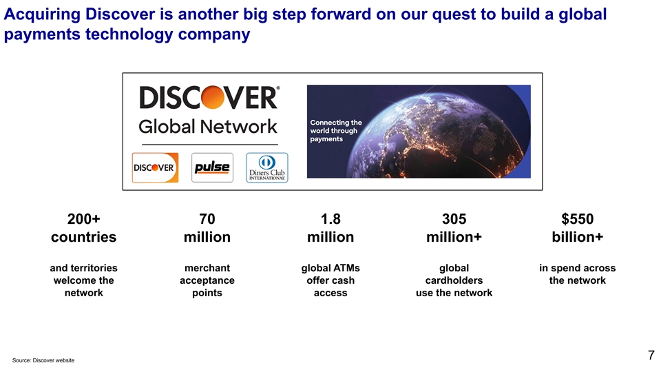 The combination delivers compelling financial metrics • 2027E Operating Expense Synergy Opportunity: $1.3B Creates significant • 2027E Marketing Expense Synergy Opportunity: $0.1B synergies • 2027E Network Synergy Opportunity: $1.2B 1 • 2027E Adjusted EPS Accretion : >15% Provides attractive returns and 2 • 2027E ROIC : 16% meaningful EPS 3 accretion • IRR : >20% • Pro Forma CET1 ratio at close: ~14% Bolsters an already strong balance sheet 4 • 2023 Pro Forma Insured Deposits : 84% Note: Market data as of February 16, 2024; Metrics reflect 100% stock consideration at a 1.0192x exchange ratio, representing a 26.6% premium to Discover share price; 1) Adjusted EPS accretion is a non-GAAP measure that excludes expected acquisition and integration expenses, amortization of intangible assets and amortization of loan credit marks and fair value marks; 2) Return on invested capital represents Discover synergized Adjusted Non-GAAP net income after taxes divided by deal 5 value less Discover excess capital at close (above 12.5%) plus incremental capital required for growth; 3) IRR terminal value assumes 9.0x NTM P/E; 4) As of December 31, 2023