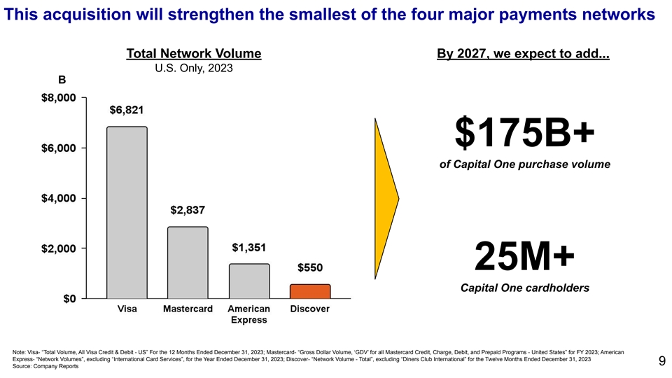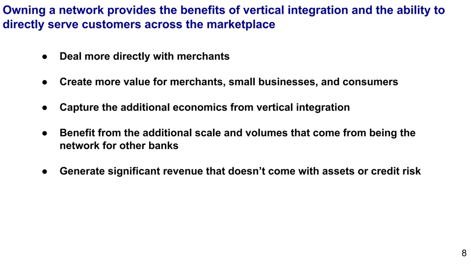 Owning a network provides the benefits of vertical integration and the ability to directly serve customers across the marketplace ● Deal more directly with merchants ● Create more value for merchants, small businesses, and consumers ● Capture the additional economics from vertical integration ● Benefit from the additional scale and volumes that come from being the network for other banks ● Generate significant revenue that doesn’t come with assets or credit risk 8