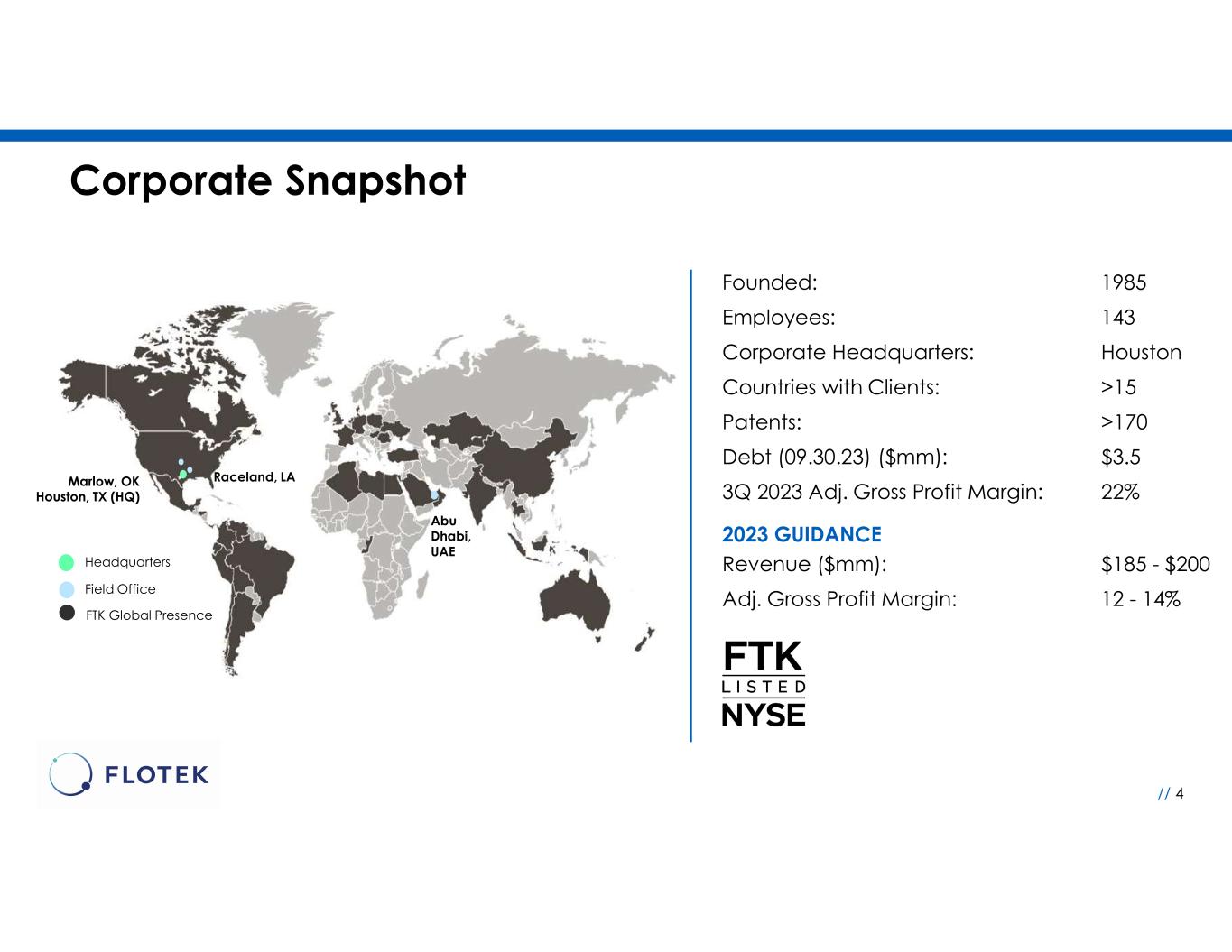 Corporate Snapshot Abu Dhabi, UAE Raceland, LAMarlow, OK Houston, TX (HQ) Headquarters Field Office // 4 FTK Global Presence Founded: 1985 Employees: 143 Corporate Headquarters: Houston Countries with Clients: >15 Patents: >170 Debt (09.30.23) ($mm): $3.5 3Q 2023 Adj. Gross Profit Margin: 22% 2023 GUIDANCE Revenue ($mm): $185 - $200 Adj. Gross Profit Margin: 12 - 14%