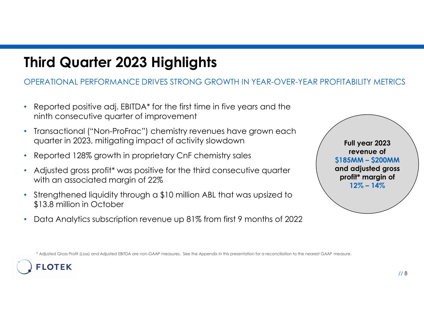 Our Strategic Priorities Industry-Leading Innovation Track record of delivering fit-for-purpose optimized chemistry and data solutions Capital-Light Growth Modest capital required to support robust growth objectives Environmental Leadership Focus on reducing impact on people, land, air, and water // 6 Sustainable Revenue 10-year contract with ProFrac generates a guaranteed minimum of $2B+ Enhanced Profitability 3Q 2023 was first quarter of positive adjusted EBITDA** since 2018 Strong Balance Sheet Minimal debt and strengthened liquidity with new ABL* facility * Asset Based Loan ** Adjusted EBITDA is a non-GAAP measure. See the Appendix in this presentation for a reconciliation to the nearest GAAP measure.