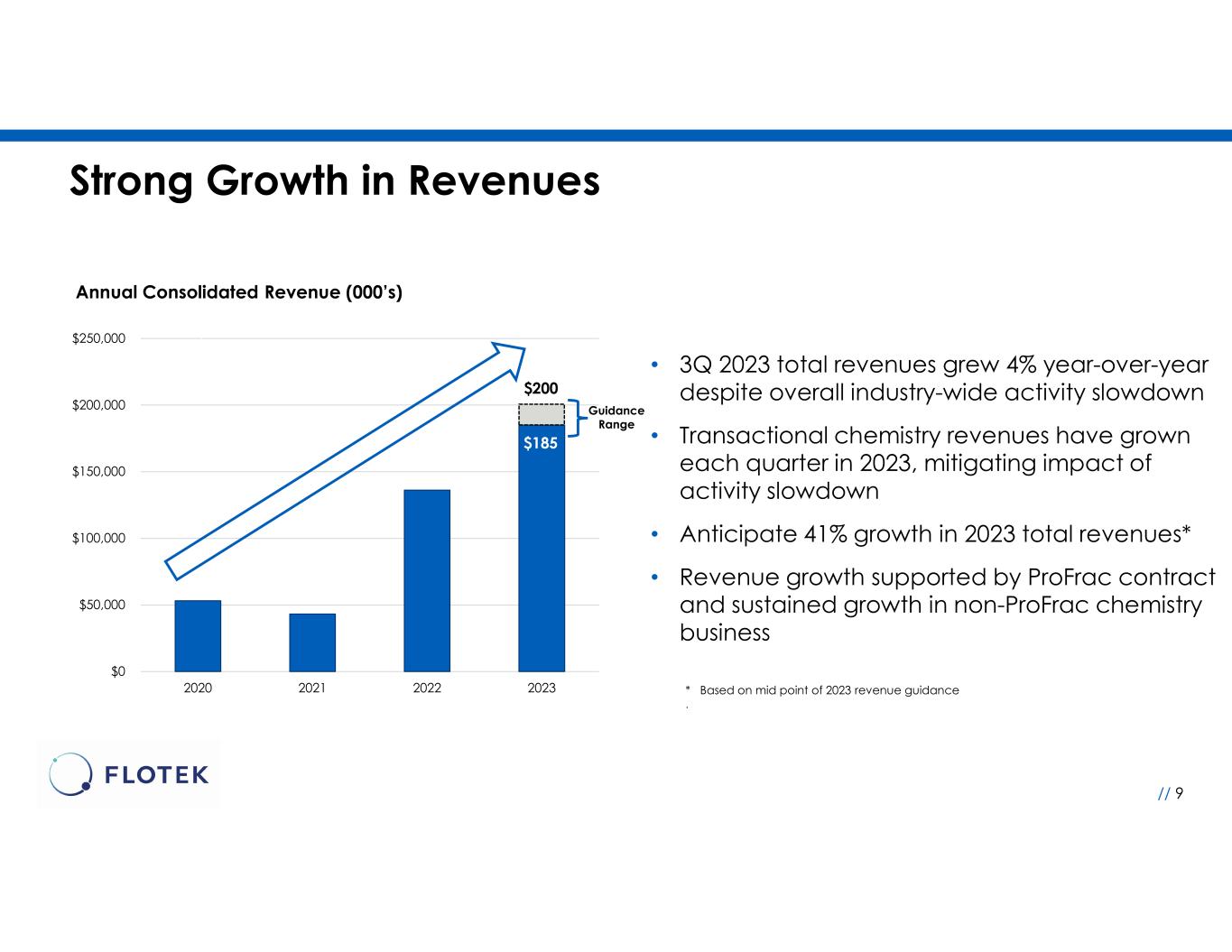 Third Quarter 2023 Highlights // 8 • Reported positive adj. EBITDA* for the first time in five years and the ninth consecutive quarter of improvement • Transactional (“Non-ProFrac”) chemistry revenues have grown each quarter in 2023, mitigating impact of activity slowdown • Reported 128% growth in proprietary CnF chemistry sales • Adjusted gross profit* was positive for the third consecutive quarter with an associated margin of 22% • Strengthened liquidity through a $10 million ABL that was upsized to $13.8 million in October • Data Analytics subscription revenue up 81% from first 9 months of 2022 * Adjusted Gross Profit (Loss) and Adjusted EBITDA are non-GAAP measures. See the Appendix in this presentation for a reconciliation to the nearest GAAP measure. Full year 2023 revenue of $185MM – $200MM and adjusted gross profit* margin of 12% – 14% OPERATIONAL PERFORMANCE DRIVES STRONG GROWTH IN YEAR-OVER-YEAR PROFITABILITY METRICS