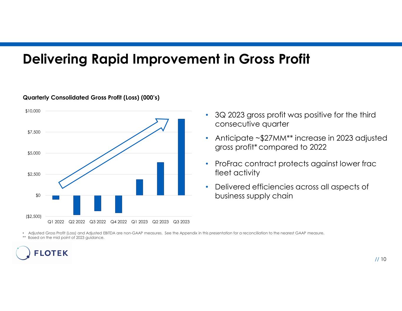 $0 $50,000 $100,000 $150,000 $200,000 $250,000 2020 2021 2022 2023 Strong Growth in Revenues // 9 • 3Q 2023 total revenues grew 4% year-over-year despite overall industry-wide activity slowdown • Transactional chemistry revenues have grown each quarter in 2023, mitigating impact of activity slowdown • Anticipate 41% growth in 2023 total revenues* • Revenue growth supported by ProFrac contract and sustained growth in non-ProFrac chemistry business Annual Consolidated Revenue (000’s) $185 $200 Guidance Range * Based on mid point of 2023 revenue guidance .