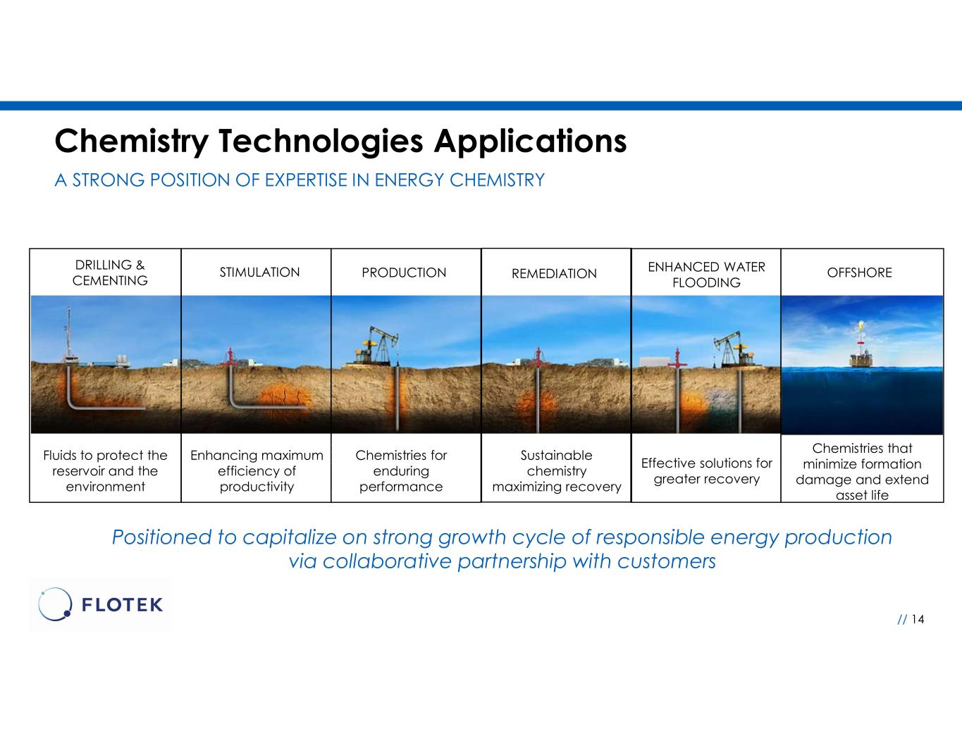 Chemistry Technologies Business Overview // 13 • Technologically advanced products and services that significantly improve well performance and maximize value of customer’s business • Extensive portfolio of customized solutions that support operations across the value chain • Industry leader in delivering innovative products that increase performance while reducing costs • Strong presence across all major U.S. shale basins • Creative solutions to reduce the environmental impact of energy on air, water, land and people