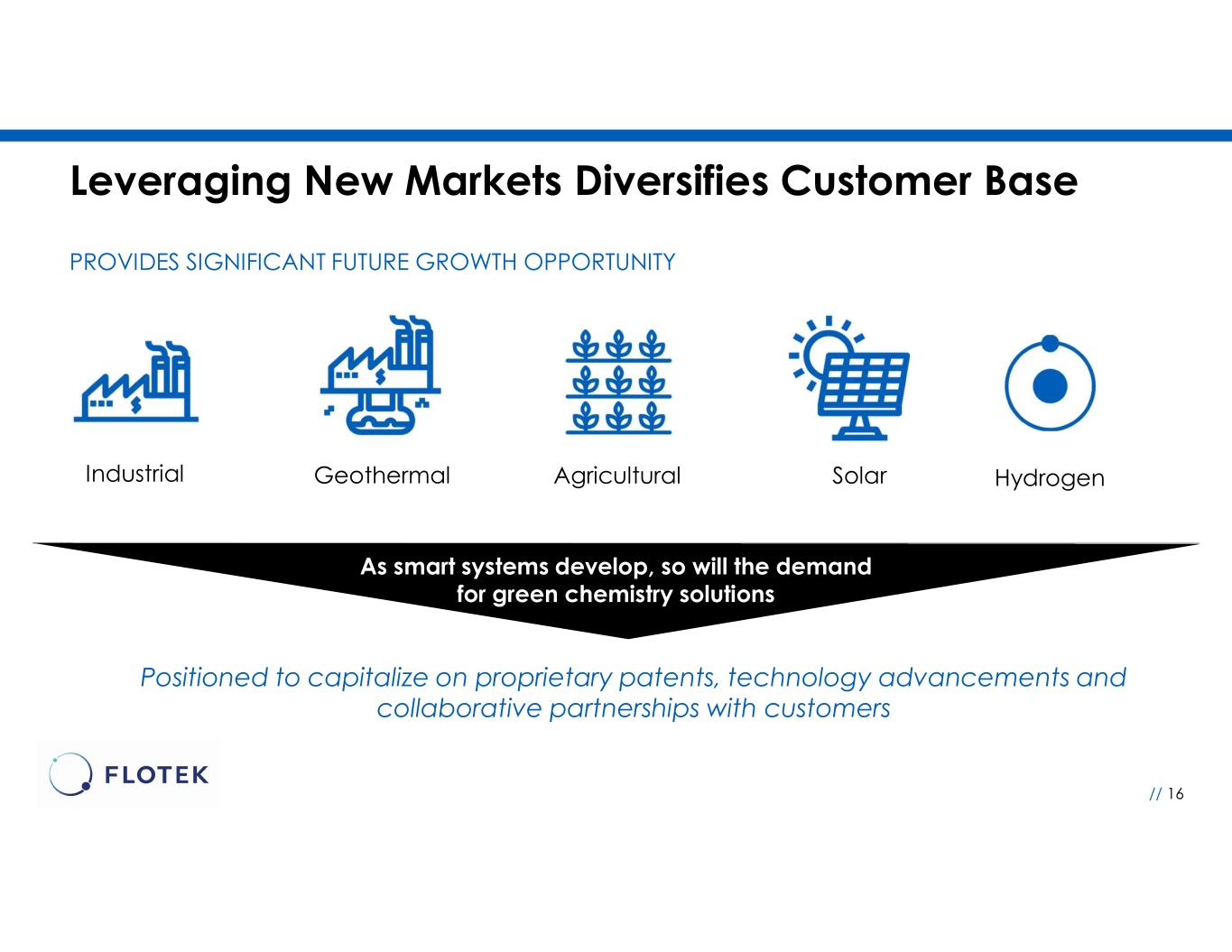 Leveraging New Markets Diversifies Customer Base // 16 PROVIDES SIGNIFICANT FUTURE GROWTH OPPORTUNITY Industrial Geothermal Agricultural Solar Hydrogen As smart systems develop, so will the demand for green chemistry solutions Positioned to capitalize on proprietary patents, technology advancements and collaborative partnerships with customers