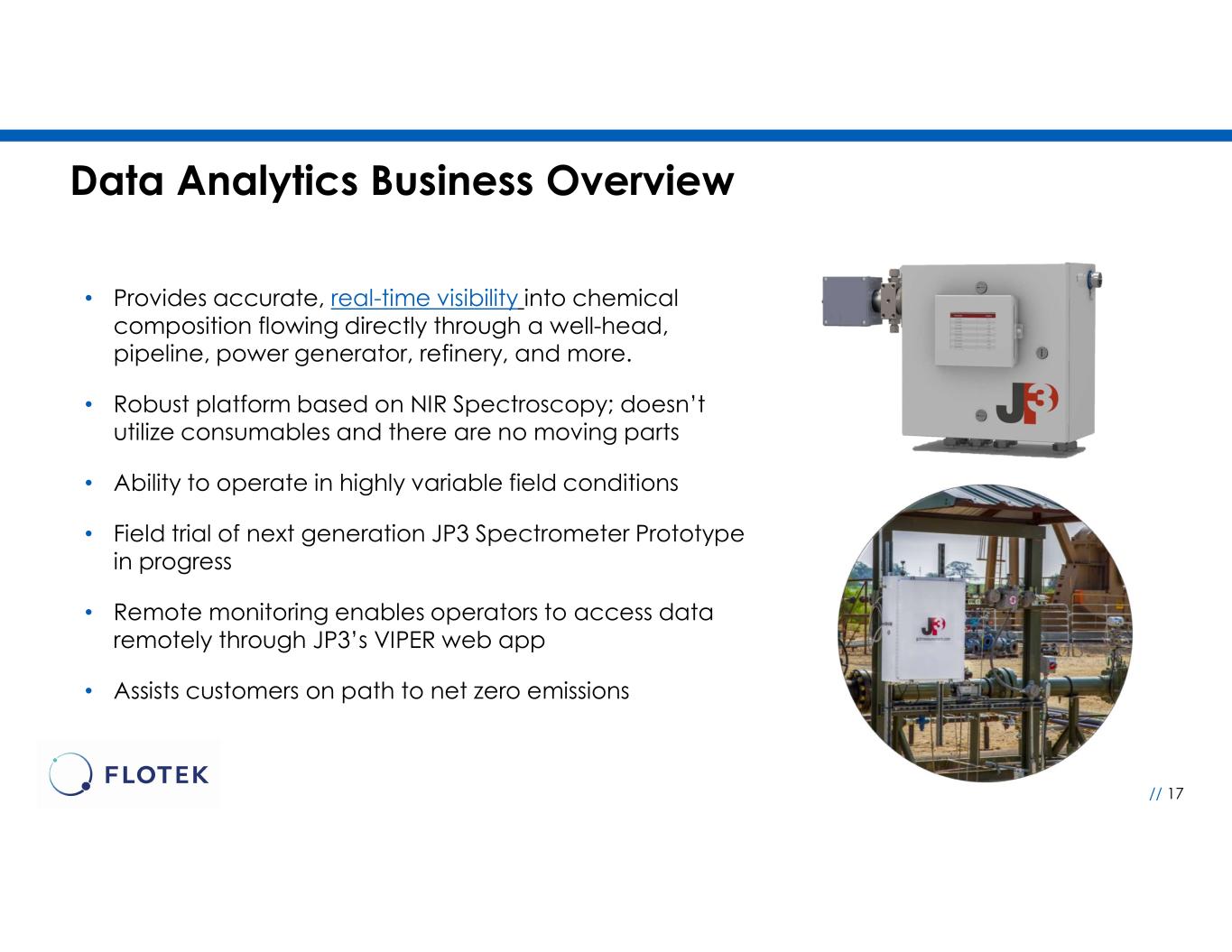 Data Analytics Business Overview // 17 • Provides accurate, real-time visibility into chemical composition flowing directly through a well-head, pipeline, power generator, refinery, and more. • Robust platform based on NIR Spectroscopy; doesn’t utilize consumables and there are no moving parts • Ability to operate in highly variable field conditions • Field trial of next generation JP3 Spectrometer Prototype in progress • Remote monitoring enables operators to access data remotely through JP3’s VIPER web app • Assists customers on path to net zero emissions