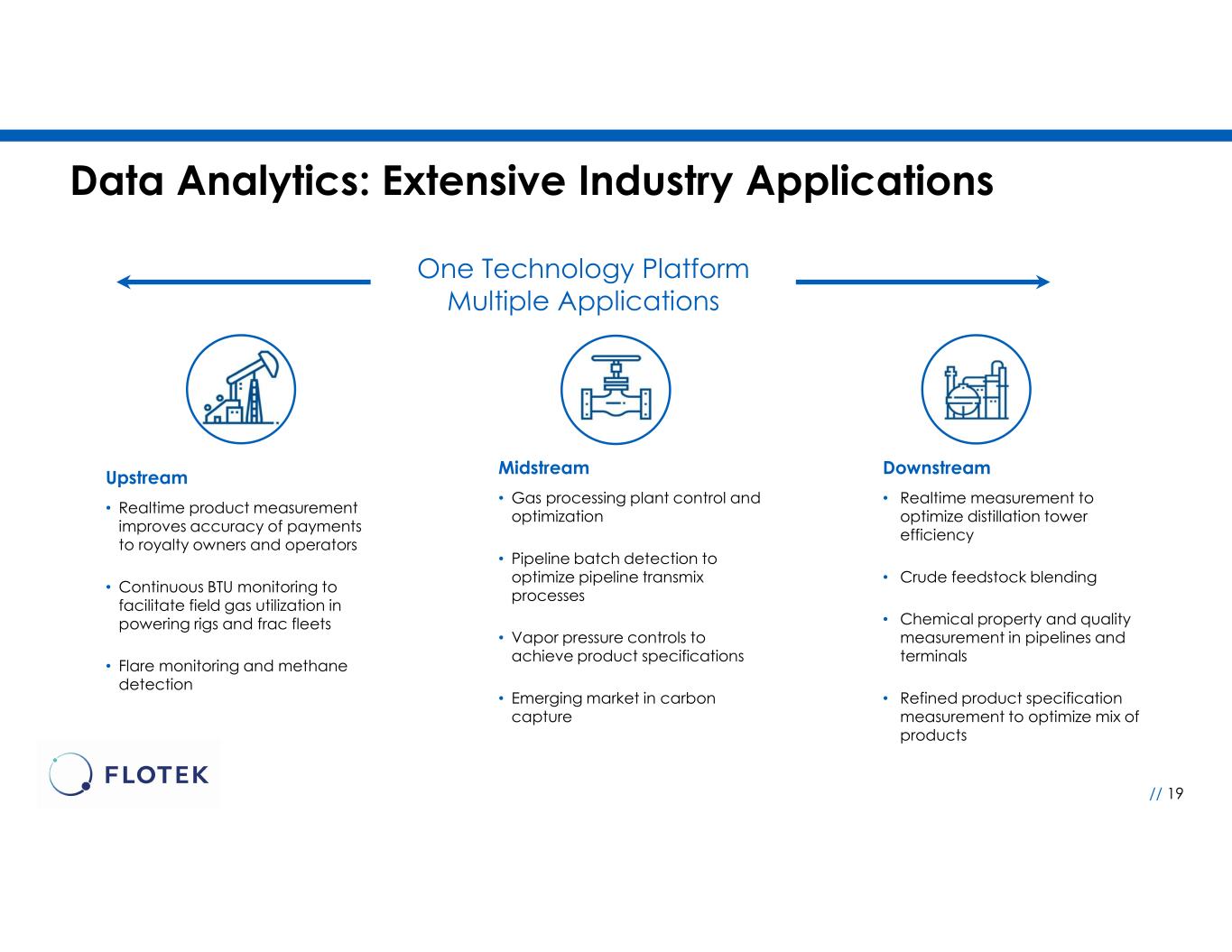 // 19 One Technology Platform Multiple Applications Data Analytics: Extensive Industry Applications Upstream • Realtime product measurement improves accuracy of payments to royalty owners and operators • Continuous BTU monitoring to facilitate field gas utilization in powering rigs and frac fleets • Flare monitoring and methane detection Midstream • Gas processing plant control and optimization • Pipeline batch detection to optimize pipeline transmix processes • Vapor pressure controls to achieve product specifications • Emerging market in carbon capture Downstream • Realtime measurement to optimize distillation tower efficiency • Crude feedstock blending • Chemical property and quality measurement in pipelines and terminals • Refined product specification measurement to optimize mix of products