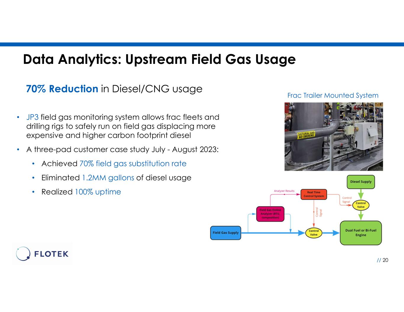 • JP3 field gas monitoring system allows frac fleets and drilling rigs to safely run on field gas displacing more expensive and higher carbon footprint diesel • A three-pad customer case study July - August 2023: • Achieved 70% field gas substitution rate • Eliminated 1.2MM gallons of diesel usage • Realized 100% uptime Data Analytics: Upstream Field Gas Usage // 20 70% Reduction in Diesel/CNG usage Frac Trailer Mounted System
