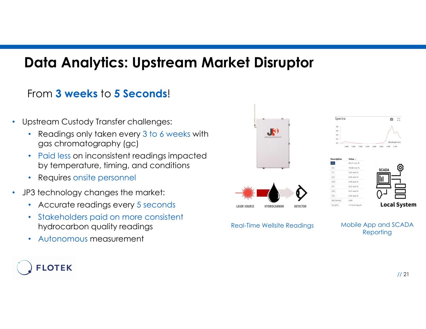 • Upstream Custody Transfer challenges: • Readings only taken every 3 to 6 weeks with gas chromatography (gc) • Paid less on inconsistent readings impacted by temperature, timing, and conditions • Requires onsite personnel • JP3 technology changes the market: • Accurate readings every 5 seconds • Stakeholders paid on more consistent hydrocarbon quality readings • Autonomous measurement Data Analytics: Upstream Market Disruptor // 21 From 3 weeks to 5 Seconds! Mobile App and SCADA Reporting Real-Time Wellsite Readings Local System