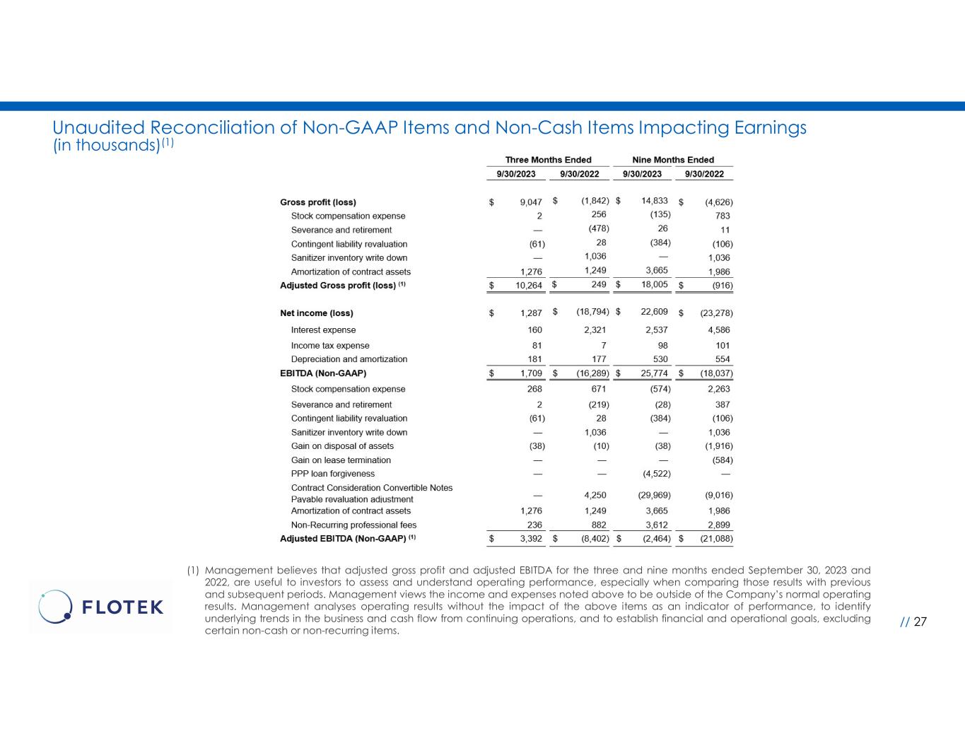 Unaudited Reconciliation of Non-GAAP Items and Non-Cash Items Impacting Earnings (in thousands)(1) // 27 (1) Management believes that adjusted gross profit and adjusted EBITDA for the three and nine months ended September 30, 2023 and 2022, are useful to investors to assess and understand operating performance, especially when comparing those results with previous and subsequent periods. Management views the income and expenses noted above to be outside of the Company’s normal operating results. Management analyses operating results without the impact of the above items as an indicator of performance, to identify underlying trends in the business and cash flow from continuing operations, and to establish financial and operational goals, excluding certain non-cash or non-recurring items.
