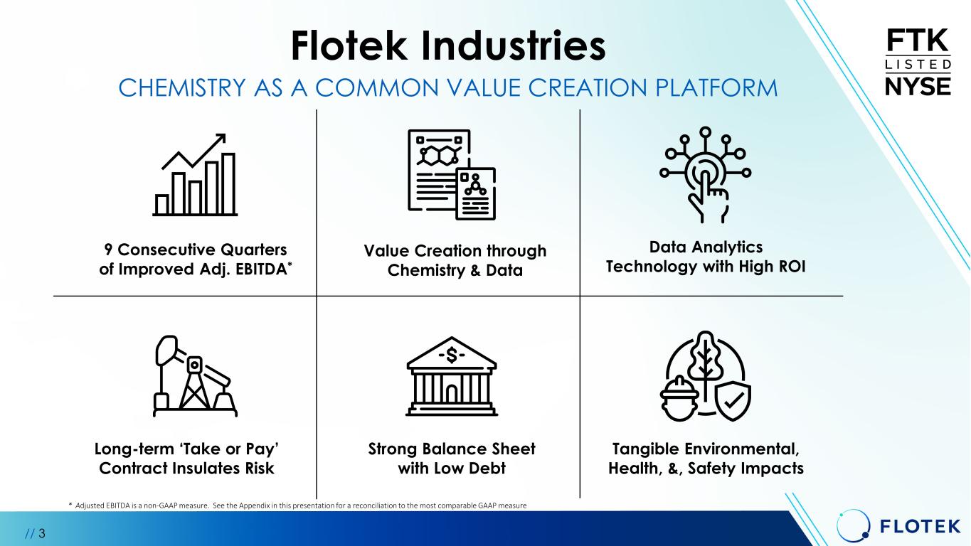 Forward-Looking Statements Certain statements set forth in this presentation constitute forward-looking statements (within the meaning of Section 27A of the Securities Act of 1933 and Section 21E of the Securities Exchange Act of 1934) regarding Flotek Industries, Inc.’s business, financial condition, results of operations and prospects. Words such as will, continue, expects, anticipates, intends, plans, believes, seeks, estimates and similar expressions or variations of such words are intended to identify forward-looking statements, but are not the exclusive means of identifying forward-looking statements in this presentation. Although forward-looking statements in this presentation reflect the good faith judgment of management, such statements can only be based on facts and factors currently known to management. Consequently, forward-looking statements are inherently subject to risks and uncertainties, and actual results and outcomes may differ materially from the results and outcomes discussed in the forward-looking statements. Further information about the risks and uncertainties that may impact the Company are set forth in the Company’s most recent filing with the Securities and Exchange Commission on Form 10-K (including, without limitation, in the "Risk Factors" section thereof), and in the Company’s other SEC filings and publicly available documents. Readers are urged not to place undue reliance on these forward-looking statements, which speak only as of the date of this presentation. The Company undertakes no obligation to revise or update any forward-looking statements in order to reflect any event or circumstance that may arise after the date of this presentation. This presentation includes certain non-GAAP measures. Please refer to the reconciliations provided in the earnings press release and the appendix in this presentation for the most comparable GAAP measure. // 2