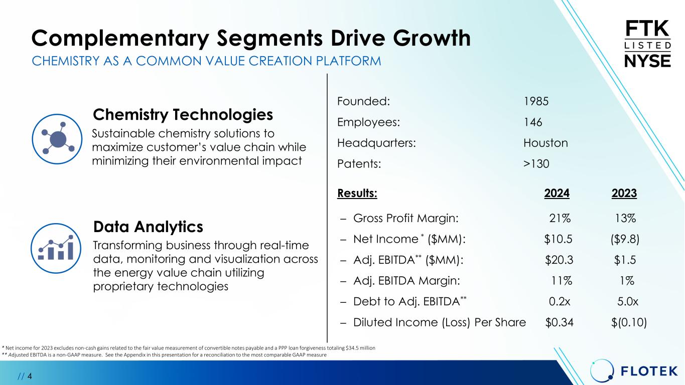 // 3 9 Consecutive Quarters of Improved Adj. EBITDA* Strong Balance Sheet with Low Debt Data Analytics Technology with High ROI Long-term ‘Take or Pay’ Contract Insulates Risk Tangible Environmental, Health, &, Safety Impacts Flotek Industries CHEMISTRY AS A COMMON VALUE CREATION PLATFORM Value Creation through Chemistry & Data * Adjusted EBITDA is a non-GAAP measure. See the Appendix in this presentation for a reconciliation to the most comparable GAAP measure