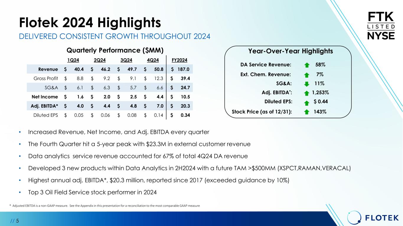 Complementary Segments Drive Growth // 4 Sustainable chemistry solutions to maximize customer’s value chain while minimizing their environmental impact Transforming business through real-time data, monitoring and visualization across the energy value chain utilizing proprietary technologies Chemistry Technologies Data Analytics CHEMISTRY AS A COMMON VALUE CREATION PLATFORM Founded: 1985 Employees: 146 Headquarters: Houston Patents: >130 Results: 2024 2023 – Gross Profit Margin: 21% 13% – Net Income * ($MM): $10.5 ($9.8) – Adj. EBITDA** ($MM): $20.3 $1.5 – Adj. EBITDA Margin: 11% 1% – Debt to Adj. EBITDA** 0.2x 5.0x – Diluted Income (Loss) Per Share $0.34 $(0.10) * Net income for 2023 excludes non-cash gains related to the fair value measurement of convertible notes payable and a PPP loan forgiveness totaling $34.5 million ** Adjusted EBITDA is a non-GAAP measure. See the Appendix in this presentation for a reconciliation to the most comparable GAAP measure