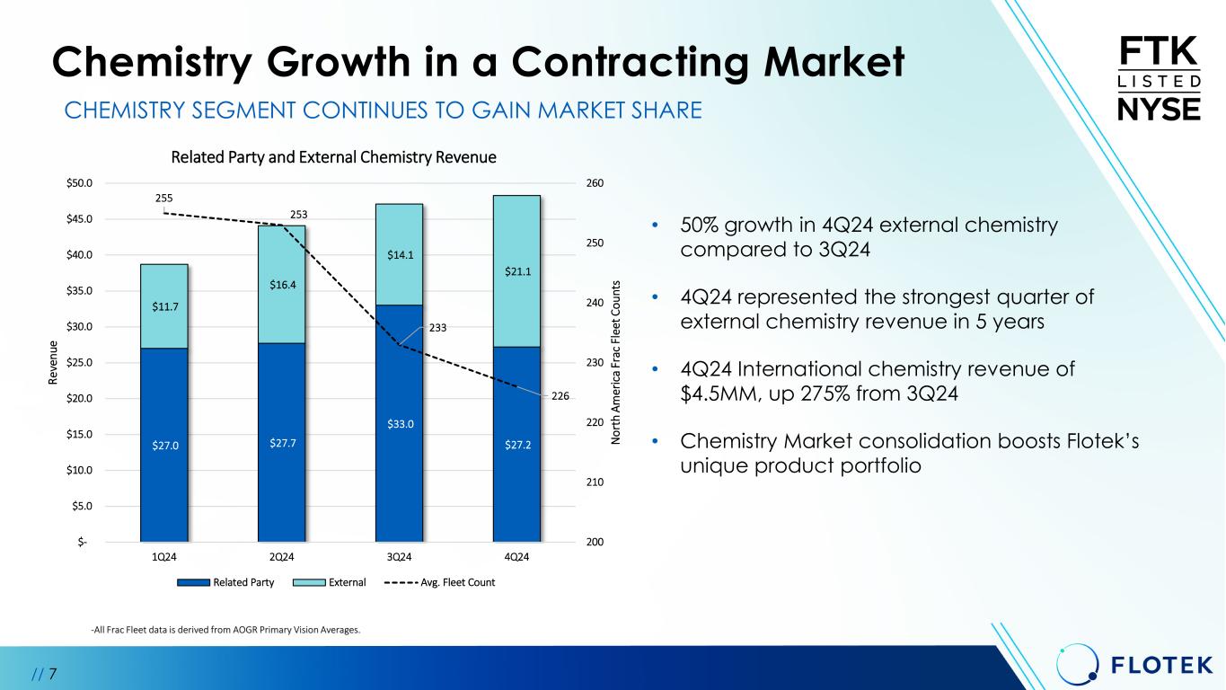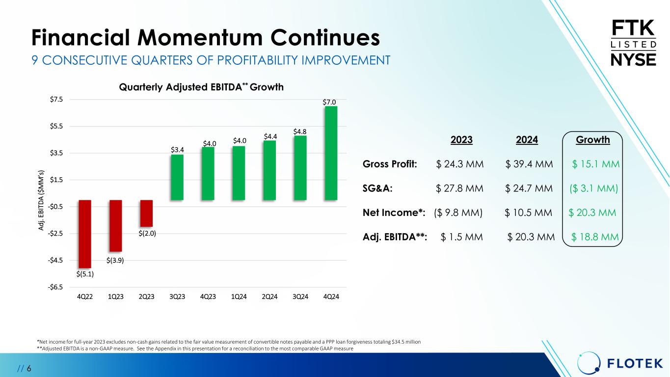 • Increased Revenue, Net Income, and Adj. EBITDA every quarter • The Fourth Quarter hit a 5-year peak with $23.3M in external customer revenue • Data analytics service revenue accounted for 67% of total 4Q24 DA revenue • Developed 3 new products within Data Analytics in 2H2024 with a future TAM >$500MM (XSPCT,RAMAN,VERACAL) • Highest annual adj. EBITDA*, $20.3 million, reported since 2017 (exceeded guidance by 10%) • Top 3 Oil Field Service stock performer in 2024 1Q24 2Q24 3Q24 4Q24 FY2024 Revenue $ 40.4 $ 46.2 $ 49.7 $ 50.8 $ 187.0 Gross Profit $ 8.8 $ 9.2 $ 9.1 $ 12.3 $ 39.4 SG&A $ 6.1 $ 6.3 $ 5.7 $ 6.6 $ 24.7 Net Income $ 1.6 $ 2.0 $ 2.5 $ 4.4 $ 10.5 Adj. EBITDA* $ 4.0 $ 4.4 $ 4.8 $ 7.0 $ 20.3 Diluted EPS $ 0.05 $ 0.06 $ 0.08 $ 0.14 $ 0.34 Flotek 2024 Highlights // 5 DELIVERED CONSISTENT GROWTH THROUGHOUT 2024 * Adjusted EBITDA is a non-GAAP measure. See the Appendix in this presentation for a reconciliation to the most comparable GAAP measure Quarterly Performance ($MM) Year-Over-Year Highlights DA Service Revenue: 58% Ext. Chem. Revenue: 7% SG&A: 11% Adj. EBITDA*: 1,253% Diluted EPS: $ 0.44 Stock Price (as of 12/31): 143%