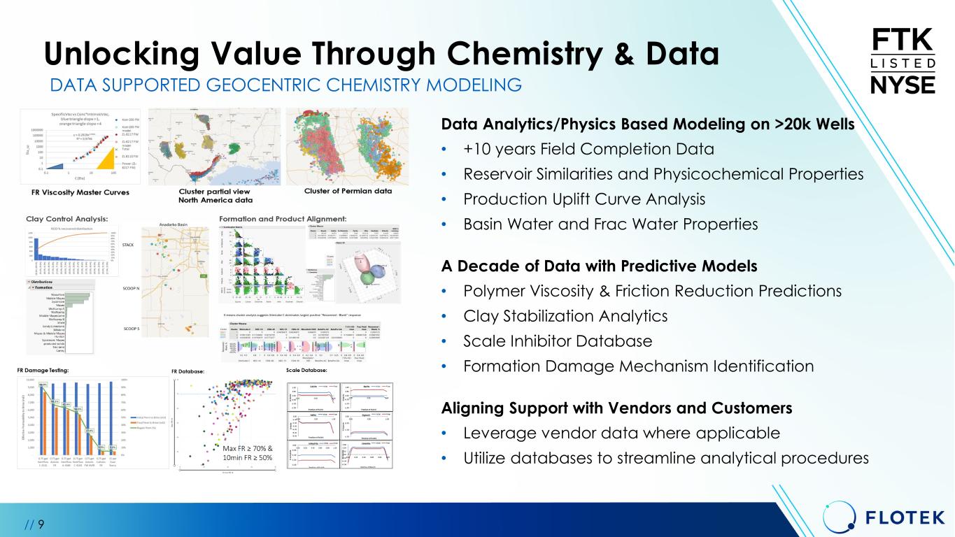 // 8 • Prescriptive Chemistry Management (PCM)TM • Proprietary energy chemistry solutions • Experienced chemistry energy team • Customized solutions to each well’s geology • AI Driven Analytics from >20,000 wells • Real-Time Field Data to Enhance Performance • Field Correlated Diagnostics • +130 Patents * Data derived from 2019-2023 Enverus Prism Platform (1,878 Permian wells) DELIVERING THE BEST WELL PERFORMANCE IN INDUSTRY 26% INCREASE IN PRODUCTION* PERFORMANCE VERSUS COMPETITION Chemistry Technologies: Competitive Advantage