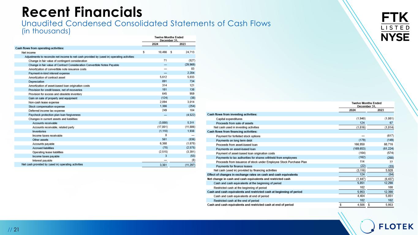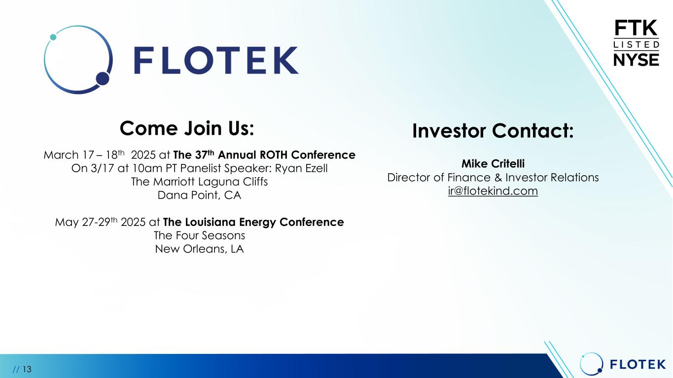 Investor Contact: Mike Critelli Director of Finance & Investor Relations ir@flotekind.com // 13 Come Join Us: March 17 – 18th 2025 at The 37th Annual ROTH Conference On 3/17 at 10am PT Panelist Speaker: Ryan Ezell The Marriott Laguna Cliffs Dana Point, CA May 27-29th 2025 at The Louisiana Energy Conference The Four Seasons New Orleans, LA