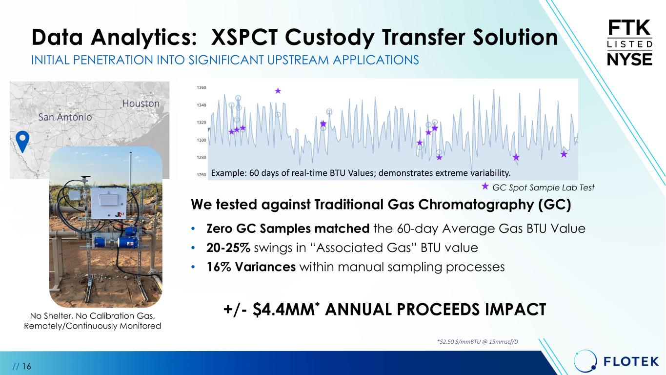 Data Analytics: VeraCal Flare Solution // 15 INITIAL PENETRATION INTO SIGNIFICANT UPSTREAM APPLICATIONS Pictured above: The proprietary VeraCal mobile flaring cart on location EPA Approval on Flaring Measurement Application • VeraCal was the first EPA approved alt. measurement solution • EPA Amendment in December 2024 delayed market demand Our Flare Measurement System is Differentiated • Continuous and autonomous monitoring • No consumable calibration gas • No manual sampling errors • Fast install and extreme durability Customer Emission Savings via EPA Subpart-W • 4-6% additional savings in emission penalties • Gain 3-4% in production before Super Emitter Status