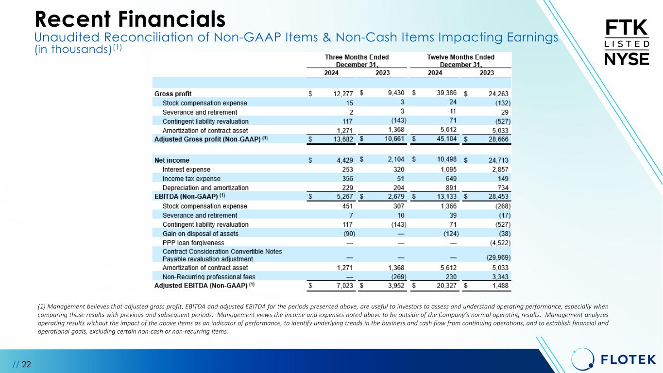 // 22 (1) Management believes that adjusted gross profit, EBITDA and adjusted EBITDA for the periods presented above, are useful to investors to assess and understand operating performance, especially when comparing those results with previous and subsequent periods. Management views the income and expenses noted above to be outside of the Company’s normal operating results. Management analyzes operating results without the impact of the above items as an indicator of performance, to identify underlying trends in the business and cash flow from continuing operations, and to establish financial and operational goals, excluding certain non-cash or non-recurring items. Recent Financials Unaudited Reconciliation of Non-GAAP Items & Non-Cash Items Impacting Earnings (in thousands)(1)