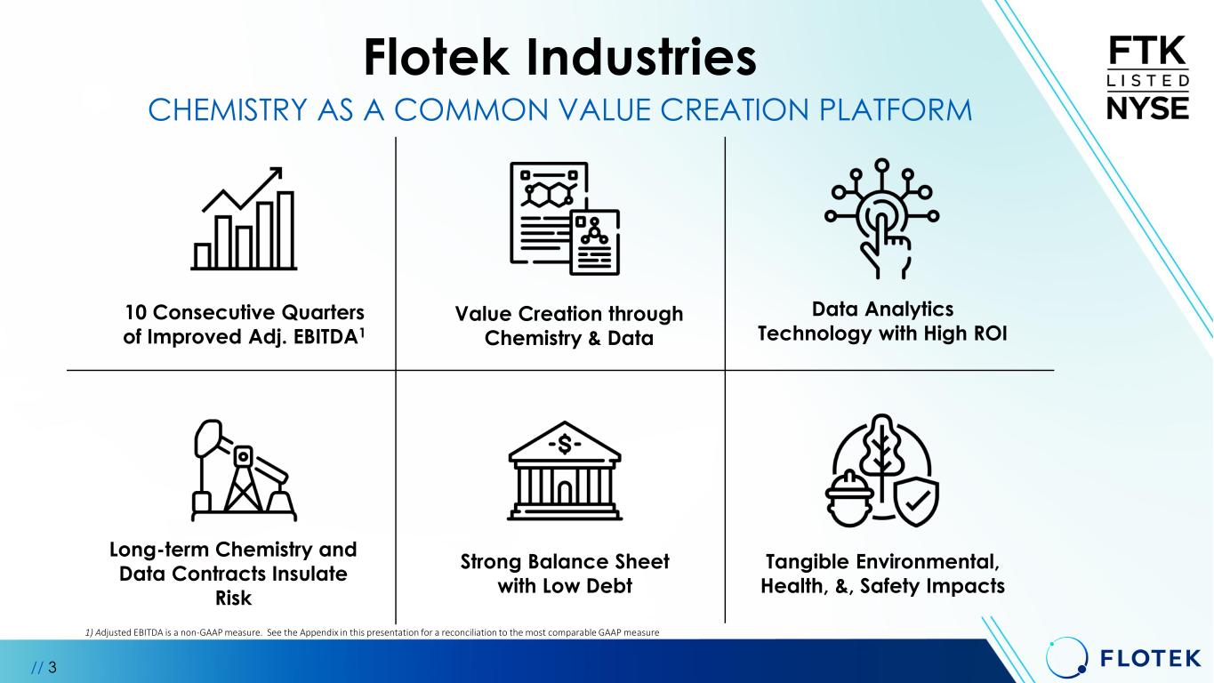 Forward-Looking Statements Certain statements set forth in this presentation constitute forward-looking statements (within the meaning of Section 27A of the Securities Act of 1933 and Section 21E of the Securities Exchange Act of 1934) regarding Flotek Industries, Inc.’s business, financial condition, results of operations and prospects. Words such as will, continue, expects, anticipates, intends, plans, believes, seeks, estimates and similar expressions or variations of such words are intended to identify forward-looking statements, but are not the exclusive means of identifying forward-looking statements in this presentation. Although forward-looking statements in this presentation reflect the good faith judgment of management, such statements can only be based on facts and factors currently known to management. Consequently, forward-looking statements are inherently subject to risks and uncertainties, and actual results and outcomes may differ materially from the results and outcomes discussed in the forward-looking statements. Further information about the risks and uncertainties that may impact the Company are set forth in the Company’s most recent filing with the Securities and Exchange Commission on Form 10-K (including, without limitation, in the "Risk Factors" section thereof), and in the Company’s other SEC filings and publicly available documents. Readers are urged not to place undue reliance on these forward-looking statements, which speak only as of the date of this presentation. The Company undertakes no obligation to revise or update any forward-looking statements in order to reflect any event or circumstance that may arise after the date of this presentation. This presentation includes certain non-GAAP measures. Please refer to the reconciliations provided in the earnings press release and the appendix in this presentation for the most comparable GAAP measure. // 2