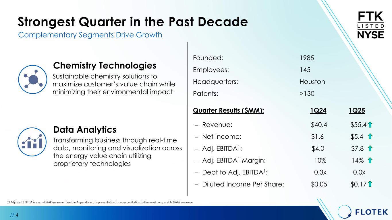 // 3 10 Consecutive Quarters of Improved Adj. EBITDA1 Strong Balance Sheet with Low Debt Data Analytics Technology with High ROI Long-term Chemistry and Data Contracts Insulate Risk Tangible Environmental, Health, &, Safety Impacts Flotek Industries CHEMISTRY AS A COMMON VALUE CREATION PLATFORM Value Creation through Chemistry & Data 1) Adjusted EBITDA is a non-GAAP measure. See the Appendix in this presentation for a reconciliation to the most comparable GAAP measure