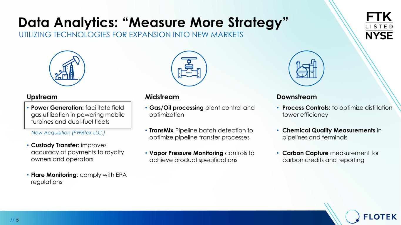 Strongest Quarter in the Past Decade // 4 Sustainable chemistry solutions to maximize customer’s value chain while minimizing their environmental impact Transforming business through real-time data, monitoring and visualization across the energy value chain utilizing proprietary technologies Chemistry Technologies Data Analytics Complementary Segments Drive Growth Founded: 1985 Employees: 145 Headquarters: Houston Patents: >130 Quarter Results ($MM): 1Q24 1Q25 – Revenue: $40.4 $55.4 – Net Income: $1.6 $5.4 – Adj. EBITDA1: $4.0 $7.8 – Adj. EBITDA1 Margin: 10% 14% – Debt to Adj. EBITDA1: 0.3x 0.0x – Diluted Income Per Share: $0.05 $0.17 1) Adjusted EBITDA is a non-GAAP measure. See the Appendix in this presentation for a reconciliation to the most comparable GAAP measure