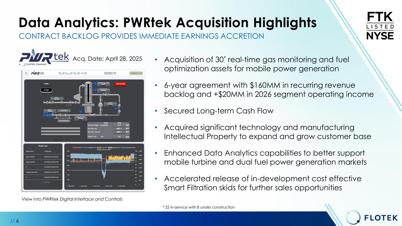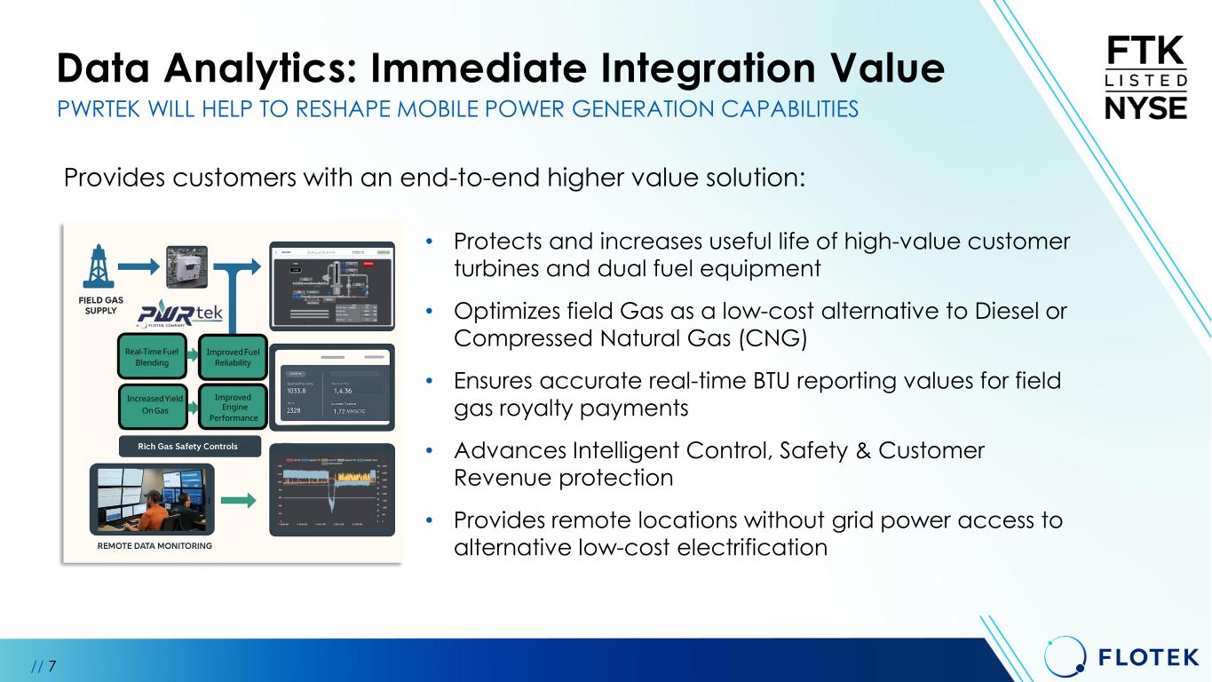 Data Analytics: PWRtek Acquisition Highlights // 6 • Acquisition of 30* real-time gas monitoring and fuel optimization assets for mobile power generation • 6-year agreement with $160MM in recurring revenue backlog and +$20MM in 2026 segment operating income • Secured Long-term Cash Flow • Acquired significant technology and manufacturing Intellectual Property to expand and grow customer base • Enhanced Data Analytics capabilities to better support mobile turbine and dual fuel power generation markets • Accelerated release of in-development cost effective Smart Filtration skids for further sales opportunities CONTRACT BACKLOG PROVIDES IMMEDIATE EARNINGS ACCRETION View into PWRtek Digital Interface and Controls * 22 in-service with 8 under construction Acq. Date: April 28, 2025