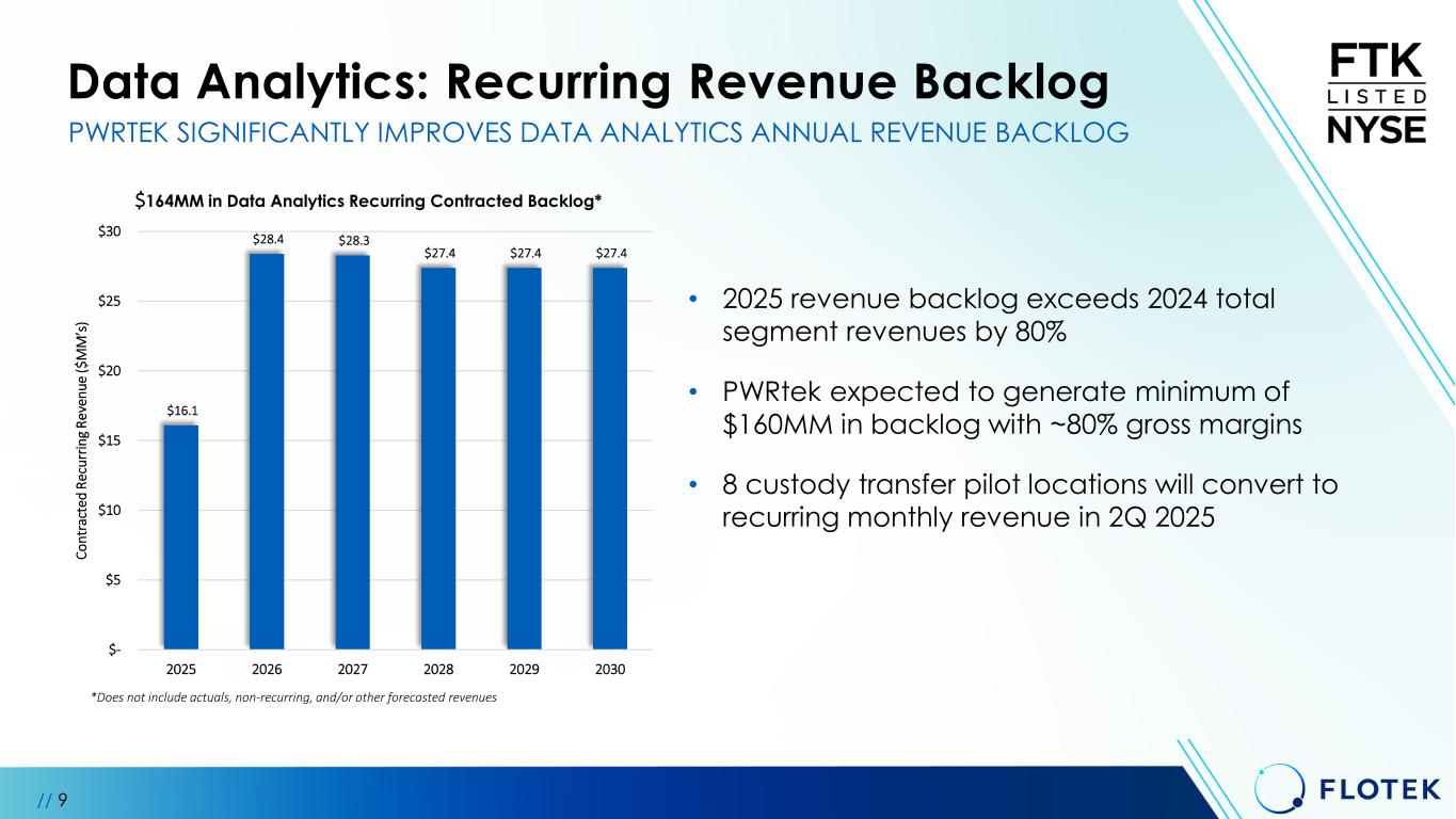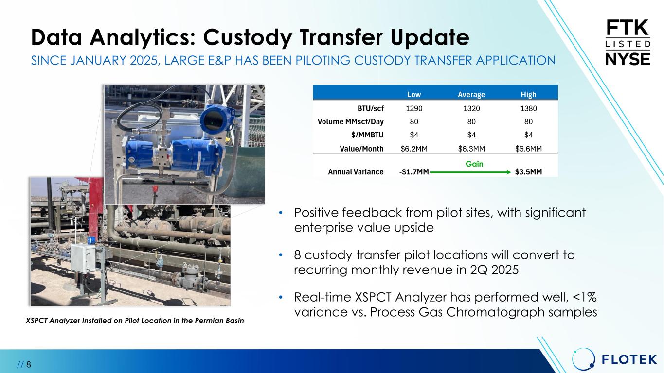Data Analytics: Custody Transfer Update // 8 • Positive feedback from pilot sites, with significant enterprise value upside • 8 custody transfer pilot locations will convert to recurring monthly revenue in 2Q 2025 • Real-time XSPCT Analyzer has performed well, <1% variance vs. Process Gas Chromatograph samples SINCE JANUARY 2025, LARGE E&P HAS BEEN PILOTING CUSTODY TRANSFER APPLICATION Low Average High BTU/scf 1290 1320 1380 Volume MMscf/Day 80 80 80 $/MMBTU $4 $4 $4 Value/Month $6.2MM $6.3MM $6.6MM Annual Variance -$1.7MM $3.5MM Gain XSPCT Analyzer Installed on Pilot Location in the Permian Basin