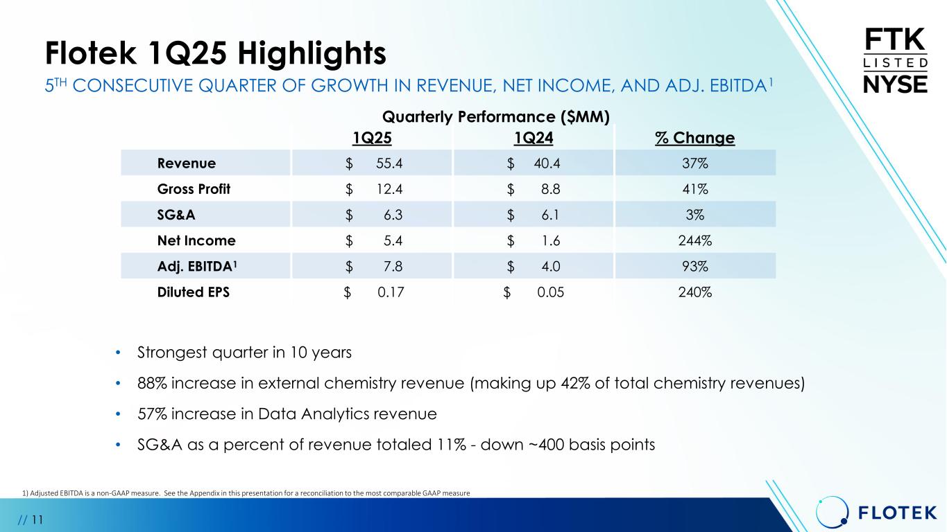 Flotek Industries Addressable Market COMPLETION CHEMISTRY OFS POWER GENERATION TRANSMIX MONITORING TREATMENT/STABILIZATION FLARE MONITORING DATA CENTER POWER GRID POWER TERMINAL & STORAGE MONITORING LNG TERMINALING AND EXPORTATION $2.6 B $9.7 B Current TAM Future TAM WATER TREATMENT ACID TREATMENT CEMENTING ADDITIVES $12.6B TAM // 10 *New PWRtek LLC