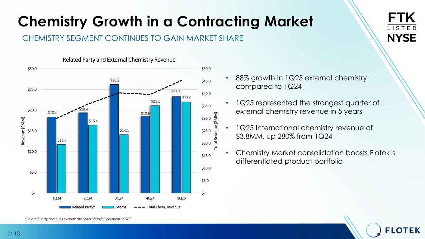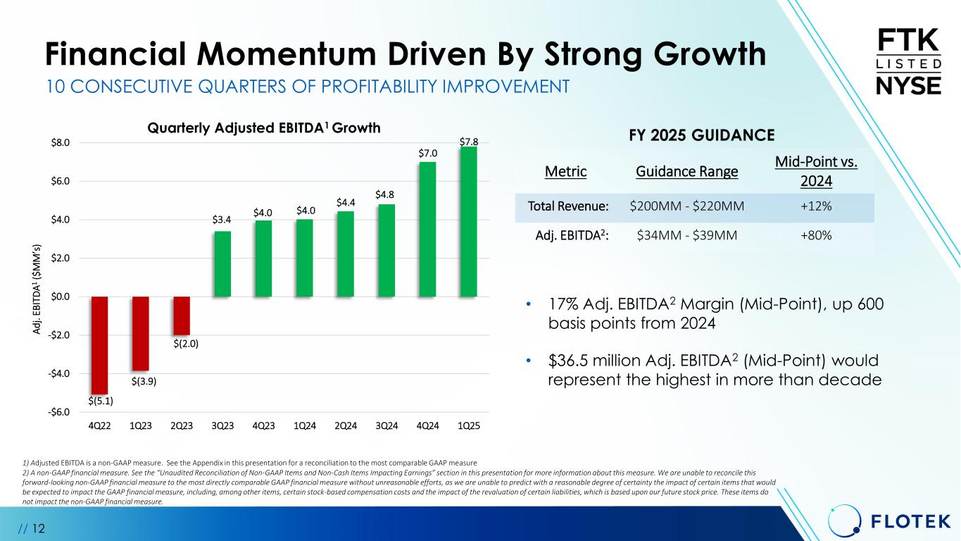 • Strongest quarter in 10 years • 88% increase in external chemistry revenue (making up 42% of total chemistry revenues) • 57% increase in Data Analytics revenue • SG&A as a percent of revenue totaled 11% - down ~400 basis points Flotek 1Q25 Highlights // 11 5TH CONSECUTIVE QUARTER OF GROWTH IN REVENUE, NET INCOME, AND ADJ. EBITDA1 1) Adjusted EBITDA is a non-GAAP measure. See the Appendix in this presentation for a reconciliation to the most comparable GAAP measure Quarterly Performance ($MM) 1Q25 1Q24 % Change Revenue $ 55.4 $ 40.4 37% Gross Profit $ 12.4 $ 8.8 41% SG&A $ 6.3 $ 6.1 3% Net Income $ 5.4 $ 1.6 244% Adj. EBITDA1 $ 7.8 $ 4.0 93% Diluted EPS $ 0.17 $ 0.05 240%