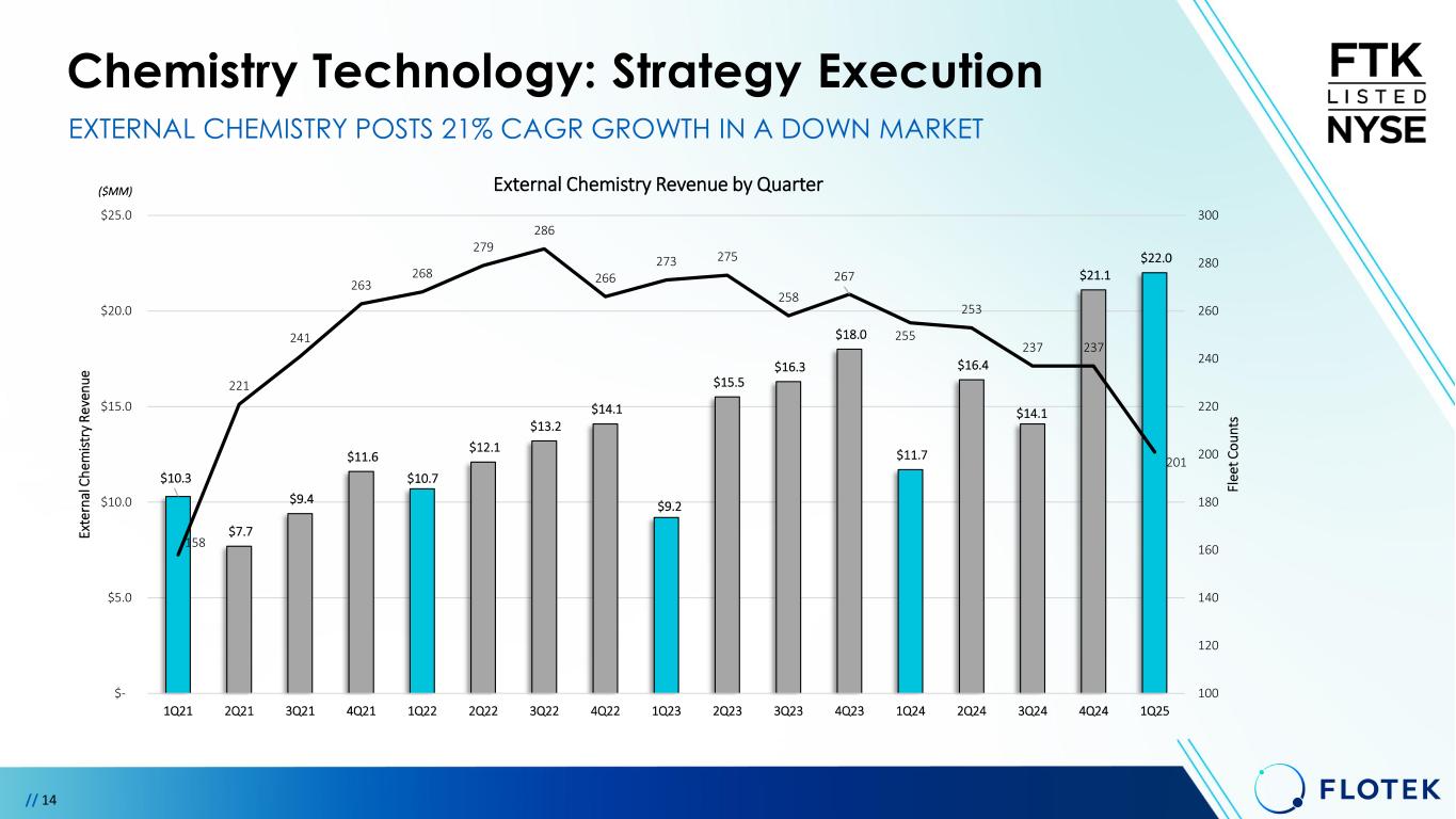 Chemistry Growth in a Contracting Market // 13 • 88% growth in 1Q25 external chemistry compared to 1Q24 • 1Q25 represented the strongest quarter of external chemistry revenue in 5 years • 1Q25 International chemistry revenue of $3.8MM, up 280% from 1Q24 • Chemistry Market consolidation boosts Flotek’s differentiated product portfolio CHEMISTRY SEGMENT CONTINUES TO GAIN MARKET SHARE *Related Party revenues exclude the order shortfall payment “OSP” $18.4 $19.4 $26.2 $18.6 $23.3 $11.7 $16.4 $14.1 $21.1 $22.0 $- $5.0 $10.0 $15.0 $20.0 $25.0 $30.0 $35.0 $40.0 $45.0 $50.0 $- $5.0 $10.0 $15.0 $20.0 $25.0 $30.0 1Q24 2Q24 3Q24 4Q24 1Q25 To ta l R e ve n u e ($ M M ) R e ve n u e ($ M M ) Related Party and External Chemistry Revenue Related Party* External Total Chem. Revenue