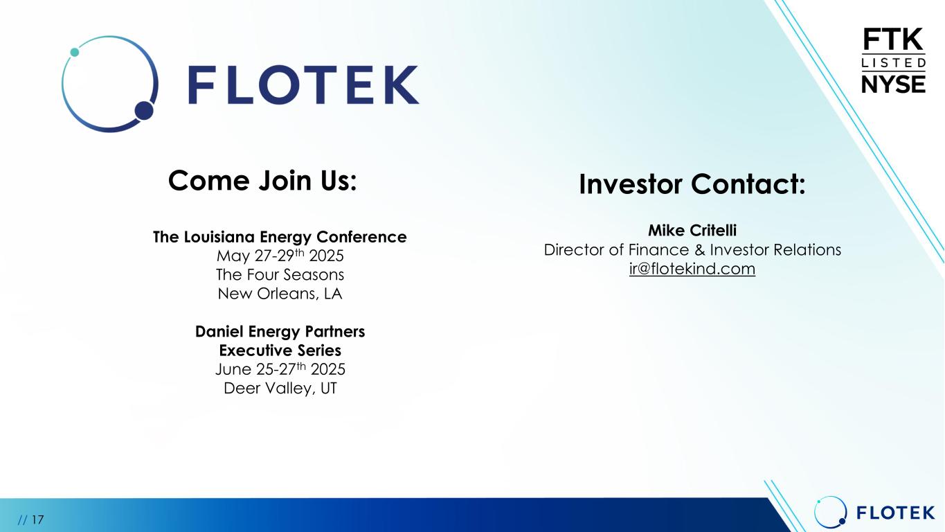 Investor Contact: Mike Critelli Director of Finance & Investor Relations ir@flotekind.com // 17 Come Join Us: The Louisiana Energy Conference May 27-29th 2025 The Four Seasons New Orleans, LA Daniel Energy Partners Executive Series June 25-27th 2025 Deer Valley, UT